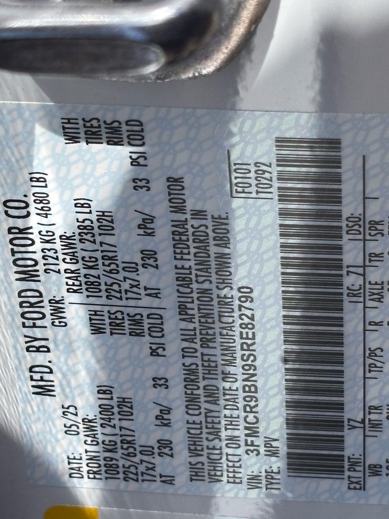 This Ford Bronco Sport is equipped with the following options: Black Diamond Off-Road Package (110V/400W AC Power Outlet, 2nd Row Carpeted Seatback, Auxiliary Switches & Wiring, Brush Guard, Cargo Management System (Shelf/Divider/Table), Cargo Mat, Class II Trailer Tow Pack w/Trailer Sway Control, Fender Tie Downs, Front & Rear Black Bumpers, Interior Grab Handle, Recovery Hooks, and Wheels: 17" Carbonized Gray Painted Aluminum), Convenience Package (Front Driver/Passenger Seat Back Map Pockets, Heated 8-Way Power Driver's Seat, LED Fog Lamps, Premium Wrapped Steering Wheel, and Universal Garage Door Opener (UGDO)), Equipment Group 200A, 4-Wheel Disc Brakes, 6 Speakers, ABS brakes, Air Conditioning, Alloy wheels, AM/FM radio: SiriusXM, AM/FM Stereo, Auto High-beam Headlights, Automatic temperature control, Brake assist, Cloth w/Easy-to-Clean Front Bucket Seats, Compass, Delay-off headlights, Driver door bin, Driver vanity mirror, Dual front impact airbags, Dual front side impact airbags, Electronic Stability Control, Emergency communication system: SYNC 4 911 Assist, Four wheel independent suspension, Front anti-roll bar, Front Bucket Seats, Front Center Armrest, Front reading lights, Fully automatic headlights, Heated door mirrors, Illuminated entry, Knee airbag, Low tire pressure warning, Occupant sensing airbag, Outside temperature display, Overhead airbag, Overhead console, Panic alarm, Passenger door bin, Passenger vanity mirror, Power door mirrors, Power steering, Power windows, Radio data system, Rear anti-roll bar, Rear Parking Sensors, Rear reading lights, Rear seat center armrest, Rear window defroster, Rear window wiper, Remote keyless entry, Security system, SiriusXM, Speed control, Speed-sensing steering, Speed-Sensitive Wipers, Split folding rear seat, Steering wheel mounted audio controls, SYNC 4 w/Enhanced Voice Recognition, Tachometer, Telescoping steering wheel, Tilt steering wheel, Traction control, Trip computer, Variably intermittent wipers, and Wheels: 17" Carbonized Gray-Painted Aluminum. Price includes: $3000 - Retail Customer Cash. Exp. 03/31/2026