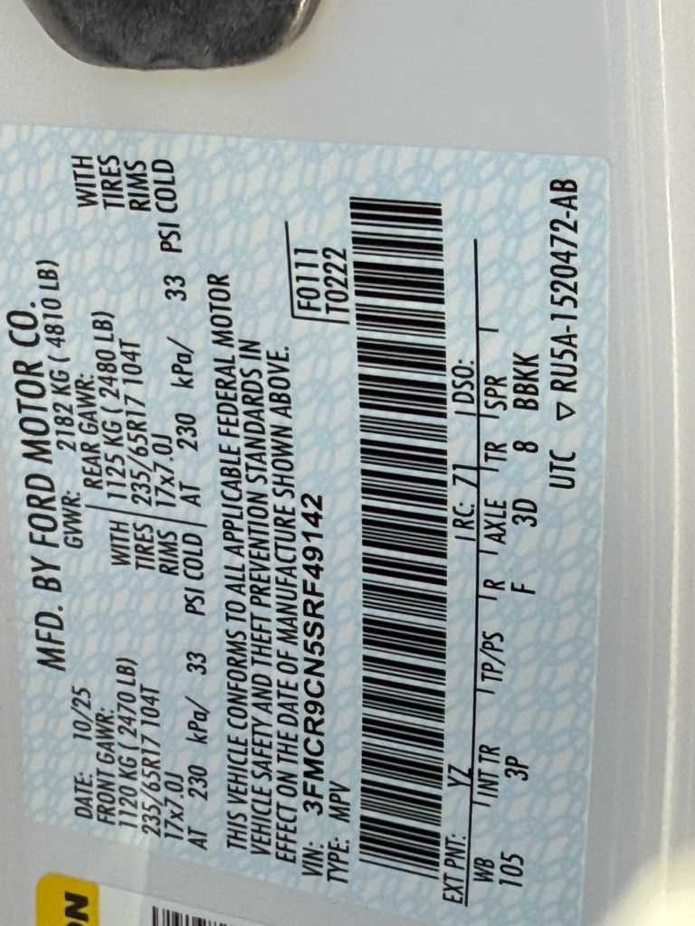 This Ford Bronco Sport is equipped with the following options: Equipment Group 300A, Outer Banks Tech Package+ (B&O Sound System by Bang & Olufsen, Connected Navigation, and HD Radio), Sasquatch Outer Banks Package (110V/400W AC Power Outlet, 2nd Row Carpeted Seatback, Auxiliary Switches & Wiring, Brush Guard, Class II Trailer Tow Pack w/Trailer Sway Control, Fender Tie Downs, Front & Rear Black Bumpers, High Clearance Fender Flares, HOSS 2.0 Off-Road Suspension, Interior Grab Handle, Recovery Hooks, Trail Control for Off-Road, and Wheels: 17" Ebony Black-Painted Aluminum), 360-Degree Camera w/Trail & Split View, 4-Wheel Disc Brakes, 6 Speakers, ABS brakes, Air Conditioning, Alloy wheels, AM/FM radio: SiriusXM, AM/FM Stereo, Auto High-beam Headlights, Auto-dimming Rear-View mirror, Automatic temperature control, Brake assist, Compass, Delay-off headlights, Driver door bin, Driver vanity mirror, Dual front impact airbags, Dual front side impact airbags, Electronic Stability Control, Emergency communication system: SYNC 4 911 Assist, Four wheel independent suspension, Front anti-roll bar, Front Bucket Seats, Front Center Armrest, Front Driver/Passenger Seat Back Map Pockets, Front dual zone A/C, Front fog lights, Front Parking Sensors, Front reading lights, Fully automatic headlights, Garage door transmitter, Heated door mirrors, Heated front seats, Heated steering wheel, Illuminated entry, Knee airbag, Low tire pressure warning, Memory seat, Occupant sensing airbag, Outside temperature display, Overhead airbag, Overhead console, Panic alarm, Passenger door bin, Passenger vanity mirror, Power door mirrors, Power driver seat, Power Moonroof, Power passenger seat, Power steering, Power windows, Premium Trimmed Front Bucket Seats w/Ebony/Roast, Radio data system, Rain sensing wipers, Rear anti-roll bar, Rear Parking Sensors, Rear reading lights, Rear seat center armrest, Rear window defroster, Rear window wiper, Remote keyless entry, Reverse Brake Assist, Security system, SiriusXM, Speed control, Speed-sensing steering, Speed-Sensitive Wipers, Split folding rear seat, Steering wheel mounted audio controls, SYNC 4 w/Enhanced Voice Recognition, Tachometer, Telescoping steering wheel, Tilt steering wheel, Traction control, Trip computer, Variably intermittent wipers, and Wheels: 18" Ebony Black-Painted Aluminum. Price includes: $1000 - Bonus Customer Cash. Exp. 01/05/2026 $1000 - Final Days Mega Bonus Cash. Exp. 01/02/2026 $500 - Retail Bonus Cash. Exp. 01/05/2026