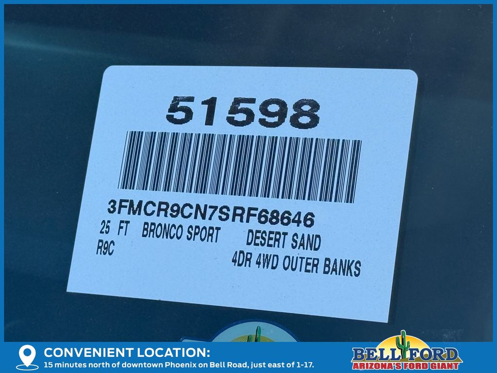 This Ford Bronco Sport is equipped with the following options: Equipment Group 300A, Outer Banks Tech Package+ (B&O Sound System by Bang & Olufsen, Connected Navigation, and HD Radio), 360-Degree Camera w/Trail & Split View, 4-Wheel Disc Brakes, 6 Speakers, ABS brakes, Air Conditioning, Alloy wheels, AM/FM radio: SiriusXM, AM/FM Stereo, Auto High-beam Headlights, Auto-dimming Rear-View mirror, Automatic temperature control, Brake assist, Compass, Delay-off headlights, Driver door bin, Driver vanity mirror, Dual front impact airbags, Dual front side impact airbags, Electronic Stability Control, Emergency communication system: SYNC 4 911 Assist, Four wheel independent suspension, Front anti-roll bar, Front Bucket Seats, Front Center Armrest, Front Driver/Passenger Seat Back Map Pockets, Front dual zone A/C, Front fog lights, Front Parking Sensors, Front reading lights, Fully automatic headlights, Garage door transmitter, Heated door mirrors, Heated front seats, Heated steering wheel, Illuminated entry, Knee airbag, Low tire pressure warning, Memory seat, Occupant sensing airbag, Outside temperature display, Overhead airbag, Overhead console, Panic alarm, Passenger door bin, Passenger vanity mirror, Power door mirrors, Power driver seat, Power passenger seat, Power steering, Power windows, Premium Trimmed Front Bucket Seats w/Ebony/Roast, Radio data system, Rain sensing wipers, Rear anti-roll bar, Rear Parking Sensors, Rear reading lights, Rear seat center armrest, Rear window defroster, Rear window wiper, Remote keyless entry, Reverse Brake Assist, Security system, SiriusXM, Speed control, Speed-sensing steering, Speed-Sensitive Wipers, Split folding rear seat, Steering wheel mounted audio controls, SYNC 4 w/Enhanced Voice Recognition, Tachometer, Telescoping steering wheel, Tilt steering wheel, Traction control, Trip computer, Variably intermittent wipers, and Wheels: 18" Ebony Black-Painted Aluminum. Price includes: $2000 - Retail Customer Cash. Exp. 03/31/2026 $500 - Bonus Customer Cash. Exp. 02/02/2026