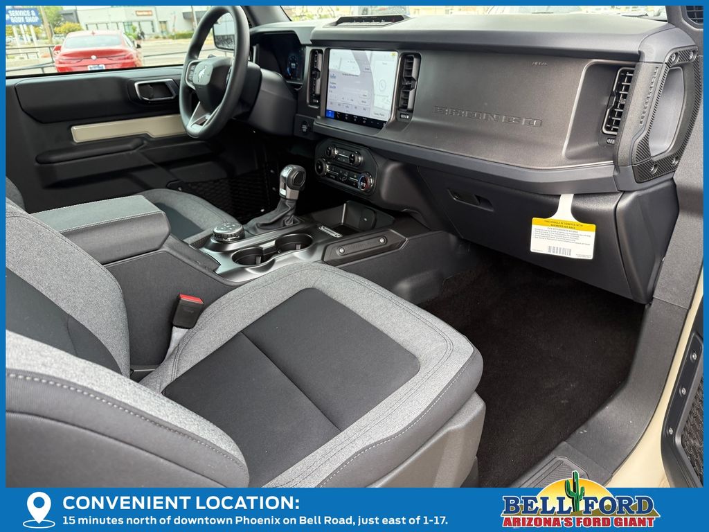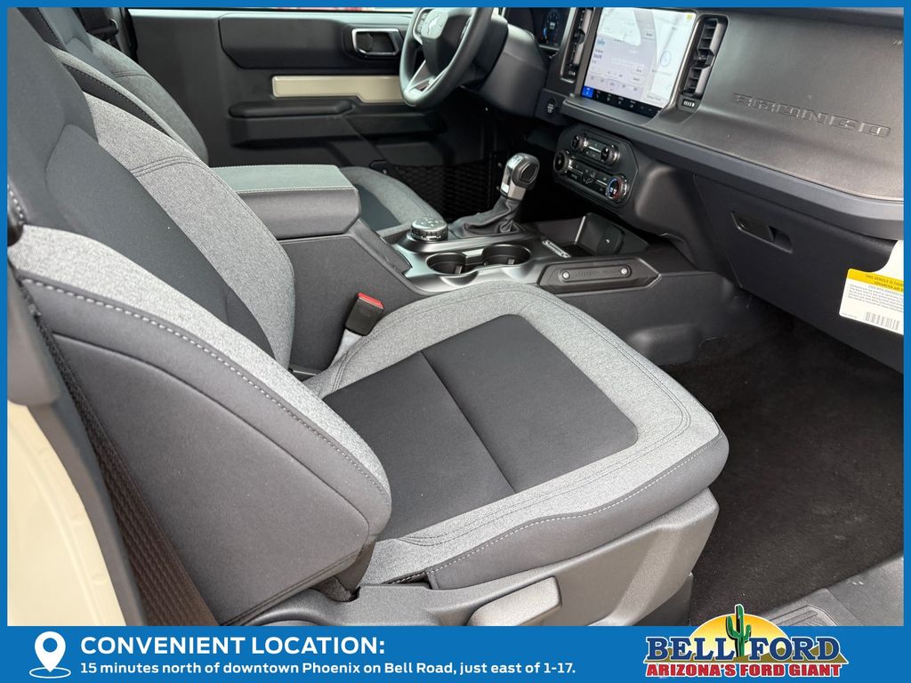 This Ford Bronco is equipped with the following options: Equipment Group 101A, Sasquatch Package (High Clearance Fender Flares, High Clearance Suspension, Position-Sensitive Bilstein Shock Absorbers, and Wheels: 17" Carbonized Gray Painted Aluminum), 4-Wheel Disc Brakes, 7 Speakers, ABS brakes, Air Conditioning, AM/FM radio: SiriusXM with 360L, AM/FM Stereo, Auto High-beam Headlights, Brake assist, Cloth Bucket Seats, Compass, Convertible HardTop, Convertible roof lining, Delay-off headlights, Driver door bin, Driver vanity mirror, Dual front impact airbags, Dual front side impact airbags, Electronic Stability Control, Emergency communication system: 911 Assist, Exterior Parking Camera Rear, Front & Rear Floor Liners w/o Carpet Floor Mats, Front anti-roll bar, Front Bucket Seats, Front Center Armrest, Front reading lights, Front wheel independent suspension, Fully automatic headlights, Glass rear window, Heated door mirrors, Illuminated entry, Integrated roll-over protection, Internet access capable: FordPass Connect, Low tire pressure warning, Occupant sensing airbag, Outside temperature display, Overhead airbag, Overhead console, Panic alarm, Passenger door bin, Passenger vanity mirror, Power door mirrors, Power steering, Power windows, Radio data system, Rear window defroster, Rear window wiper, Remote keyless entry, Security system, SiriusXM w/360L, Speed control, Split folding rear seat, Steering wheel mounted audio controls, SYNC 4, Tachometer, Telescoping steering wheel, Tilt steering wheel, Traction control, Trip computer, Variably intermittent wipers, and Wheels: 16" Bright Polished Silver-Painted Steel. Price includes: $1000 - SUV Spike Retail Bonus Cash. Exp. 03/02/2026 $2500 - Retail Customer Cash. Exp. 03/31/2026