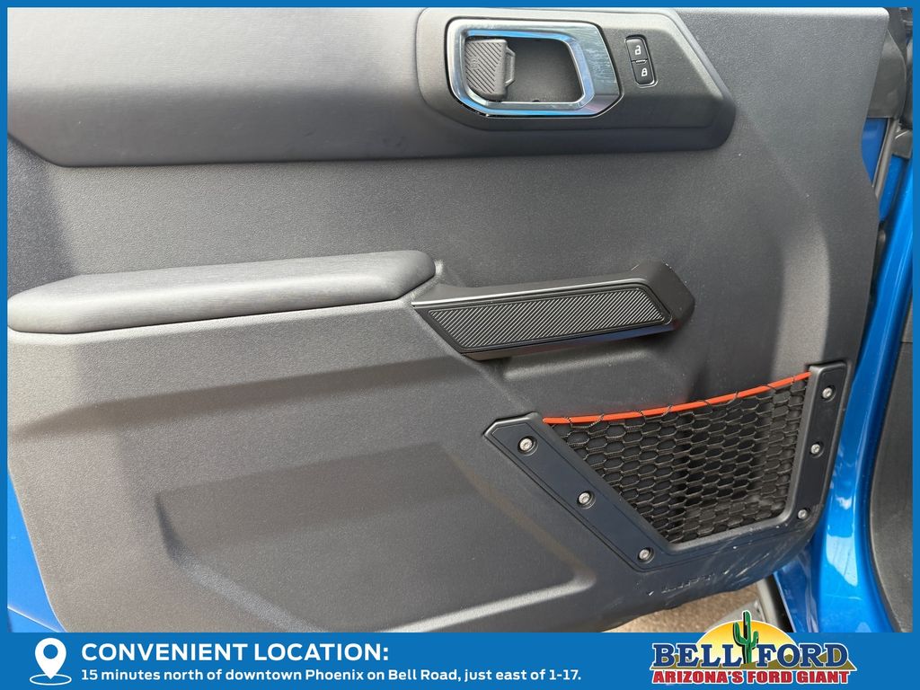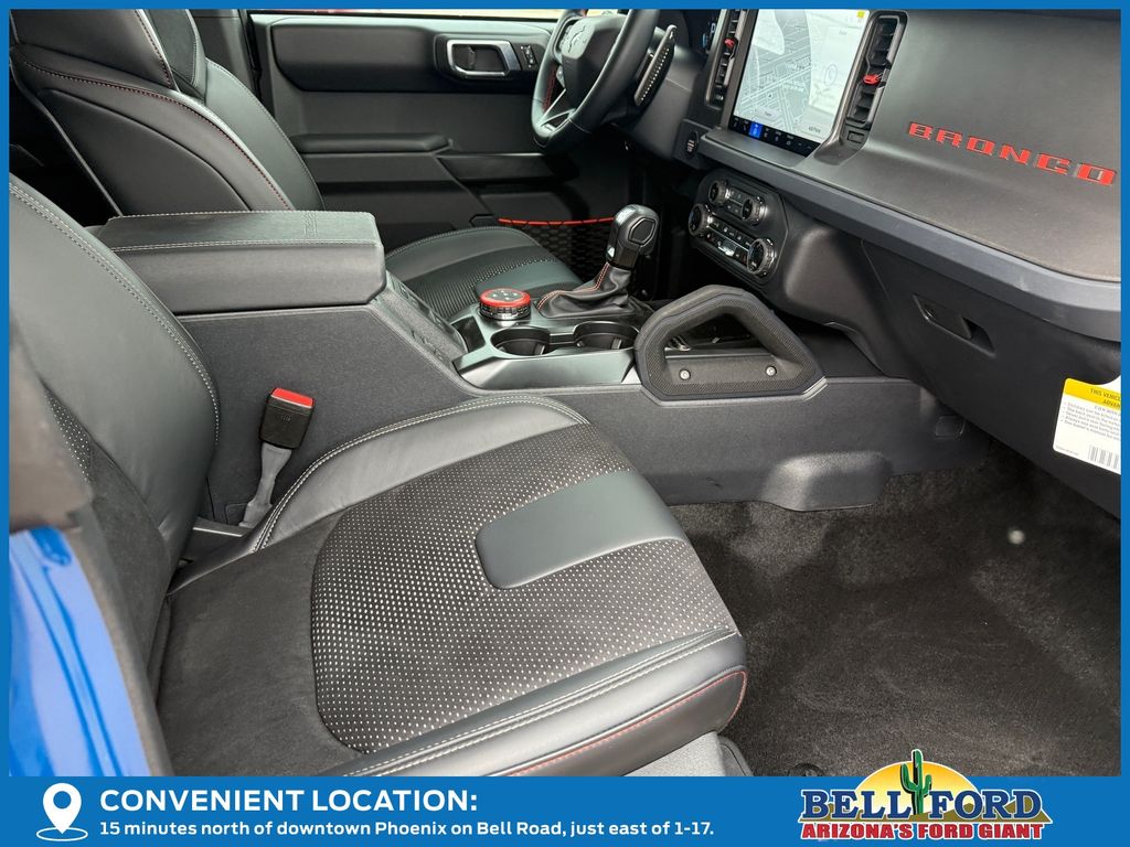 This Ford Bronco is equipped with the following options: Equipment Group 374A Lux Package, 12 Speakers, 4-Wheel Disc Brakes, ABS brakes, Air Conditioning, Alloy wheels, AM/FM radio: SiriusXM with 360L, Auto High-beam Headlights, Auto-dimming Rear-View mirror, Automatic temperature control, Body Color-Painted Hard Top, Brake assist, Compass, Connected Navigation, Convertible HardTop, Convertible roof lining, Delay-off headlights, Driver door bin, Driver vanity mirror, Dual front impact airbags, Dual front side impact airbags, Electronic Stability Control, Emergency communication system: 911 Assist, Exterior Parking Camera Rear, Front anti-roll bar, Front Bucket Seats, Front Center Armrest, Front dual zone A/C, Front fog lights, Front License Plate Bracket, Front reading lights, Front wheel independent suspension, Fully automatic headlights, Garage door transmitter, Glass rear window, Hard Top Sound Deadening Headliner, Heated door mirrors, Heated front seats, Heated steering wheel, Illuminated entry, Integrated roll-over protection, Internet access capable: FordPass Connect, Leather Shift Knob, Low tire pressure warning, Marine Grade Vinyl Bucket Seats, Navigation system: Connected Navigation, Occupant sensing airbag, Outside temperature display, Overhead airbag, Overhead console, Panic alarm, Passenger door bin, Passenger vanity mirror, Power door mirrors, Power steering, Power windows, Radio data system, Radio: B&O Sound System by Bang & Olufsen, Rear anti-roll bar, Rear seat center armrest, Rear window defroster, Rear window wiper, Rear-Window Defroster & Washer, Remote keyless entry, Security system, SiriusXM w/360L, Speed control, Split folding rear seat, Steering wheel mounted audio controls, SYNC 4, Tachometer, Telescoping steering wheel, Tilt steering wheel, Traction control, Trip computer, Turn signal indicator mirrors, Variably intermittent wipers, Voltmeter, Wheels: 17" Black High Gloss-Painted Aluminum, and Wheels: 17" Dark Carbonized Gray Alloy Painted.
