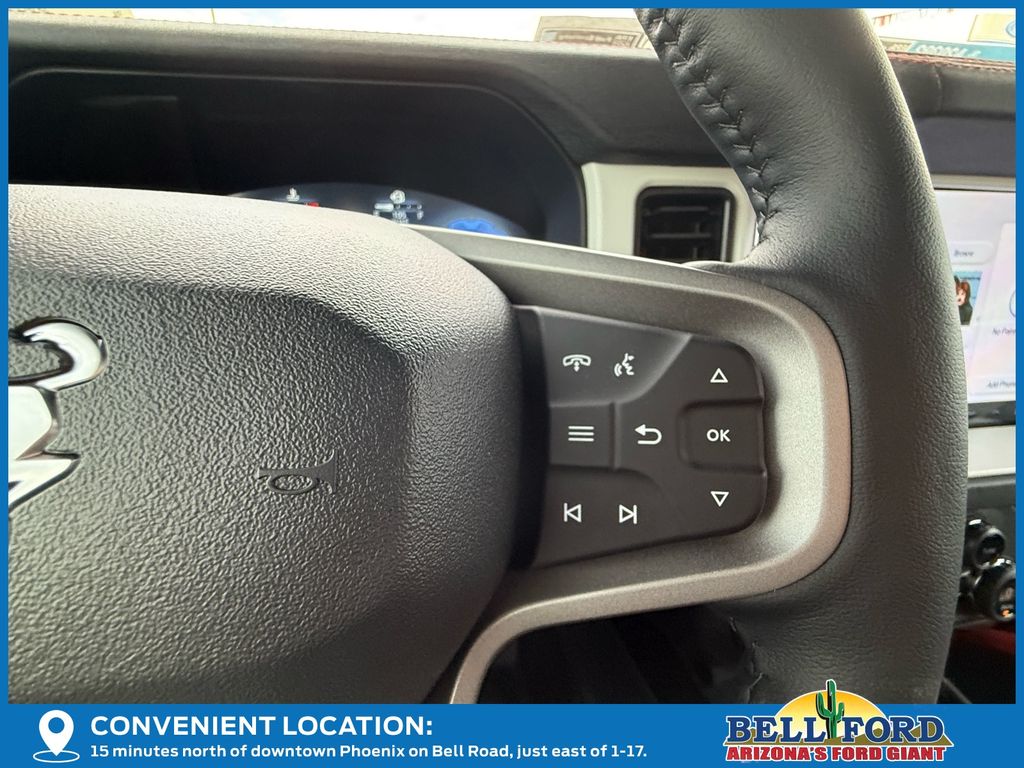 This Ford Bronco is equipped with the following options: ABS brakes, Active Cruise Control, Alloy wheels, Compass, Electronic Stability Control, Front dual zone A/C, Heated door mirrors, Heated front seats, Illuminated entry, Low tire pressure warning, Navigation System, Remote keyless entry, Traction control, 12 Speakers, 4-Wheel Disc Brakes, Air Conditioning, AM/FM radio: SiriusXM with 360L, Auto High-beam Headlights, Auto-dimming Rear-View mirror, Automatic temperature control, Brake assist, Connected Navigation, Convertible HardTop, Convertible roof lining, Delay-off headlights, Driver door bin, Driver vanity mirror, Dual front impact airbags, Dual front side impact airbags, Emergency communication system: 911 Assist, Exterior Parking Camera Rear, Front anti-roll bar, Front Bucket Seats, Front Center Armrest, Front reading lights, Front wheel independent suspension, Fully automatic headlights, Garage door transmitter, Glass rear window, Heated steering wheel, Integrated roll-over protection, Leather Shift Knob, Navigation system: Connected Navigation, Occupant sensing airbag, Outside temperature display, Overhead airbag, Overhead console, Panic alarm, Passenger door bin, Passenger vanity mirror, Power door mirrors, Power steering, Power windows, Radio data system, Radio: B&O Sound System by Bang & Olufsen, Rear anti-roll bar, Rear window defroster, Rear window wiper, Security system, SiriusXM w/360L, Speed control, Split folding rear seat, Steering wheel mounted audio controls, SYNC 4, Tachometer, Telescoping steering wheel, Tilt steering wheel, Trip computer, Turn signal indicator mirrors, Unique Vinyl Bucket Seats, Variably intermittent wipers, Voltmeter, and Wheels: 17" Unique Matte Black-Painted Alloy.
