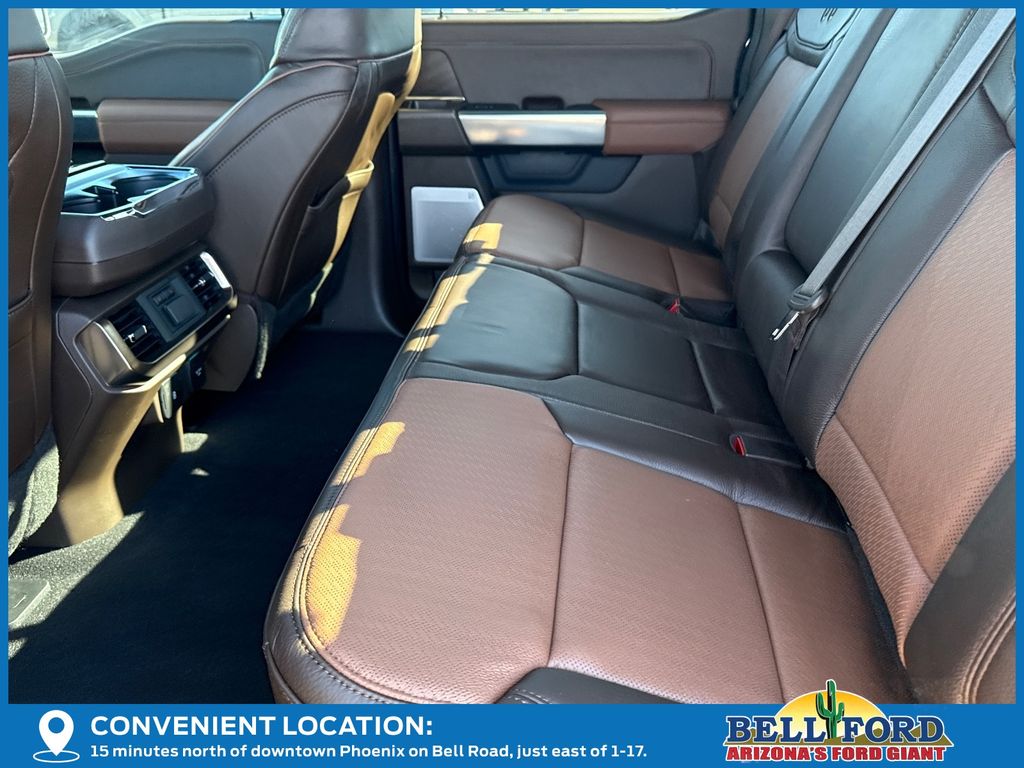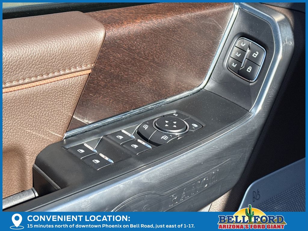 This Ford F-150 is equipped with the following options: Equipment Group 601A High, FX4 Off-Road Package (4x4 FX4 Off-Road Bodyside Decal, Hill Descent Control, Monotube Rear Shocks, Off-Road Tuned Front Shock Absorbers, and Rock Crawl Mode), 3.5L PowerBoost Full-Hybrid V6, 4WD, 14 Speakers, 4-Wheel Disc Brakes, ABS brakes, Adjustable pedals, Air Conditioning, Alloy wheels, AM/FM radio: SiriusXM with 360L, Auto High-beam Headlights, Auto tilt-away steering wheel, Auto-dimming door mirrors, Auto-dimming Rear-View mirror, Automatic temperature control, Brake assist, Chrome wheels, Compass, Delay-off headlights, Driver door bin, Driver vanity mirror, Dual front impact airbags, Dual front side impact airbags, Electronic Stability Control, Emergency communication system: SYNC 4 911 Assist, First Aid Kit w/Ford Logo, Front anti-roll bar, Front Bucket Seats, Front Center Armrest, Front dual zone A/C, Front fog lights, Front reading lights, Front wheel independent suspension, Fully automatic headlights, Garage door transmitter, Genuine wood dashboard insert, Heads-Up Display, Heated door mirrors, Heated front seats, Heated rear seats, Heated steering wheel, Illuminated entry, Internet access capable: FordPass Connect 5G, King Ranch Multicontour Leather Bucket Seats, Leather steering wheel, Low tire pressure warning, Memory seat, Navigation system: Connected Navigation, Occupant sensing airbag, Outside temperature display, Overhead airbag, Overhead console, Panic alarm, Passenger door bin, Passenger vanity mirror, Pedal memory, Power door mirrors, Power driver seat, Power moonroof, Power passenger seat, Power steering, Power windows, Radio data system, Radio: B&O Unleashed Sound System by Bang & Olufsen, Rain sensing wipers, Rear reading lights, Rear seat center armrest, Rear step bumper, Rear window defroster, Remote keyless entry, Security system, Speed control, Split folding rear seat, Steering wheel memory, Steering wheel mounted audio controls, SYNC 4 w/Enhanced Voice Recognition, Tachometer, Telescoping steering wheel, Tilt steering wheel, Traction control, Trip computer, Turn signal indicator mirrors, Variably intermittent wipers, Ventilated front seats, Voltmeter, and Wheels: 20" Chrome-Like PVD.