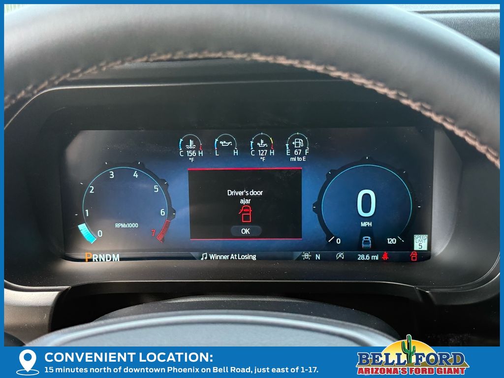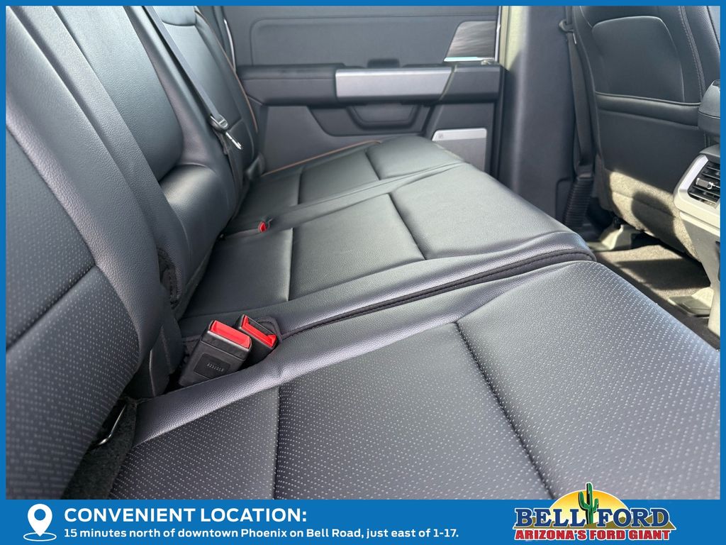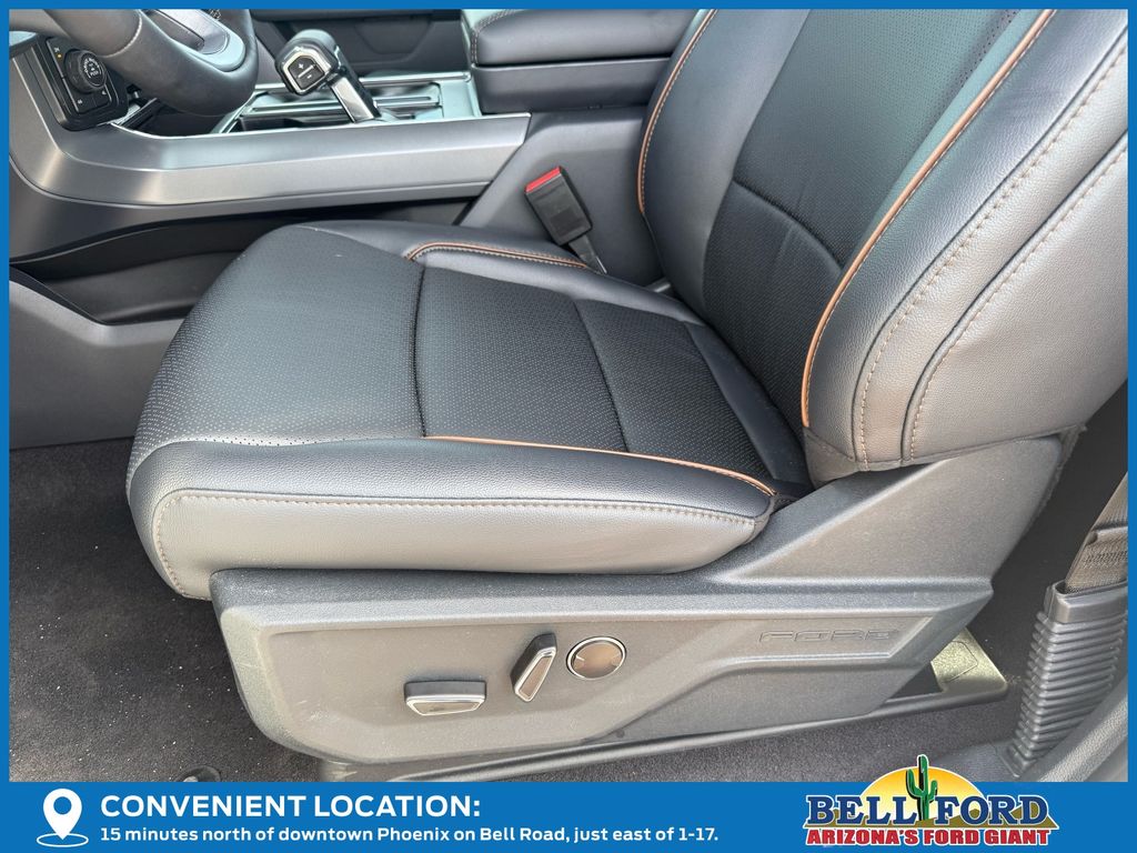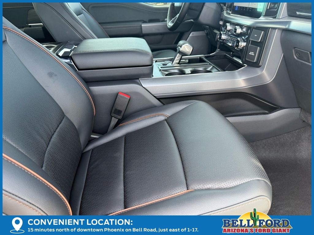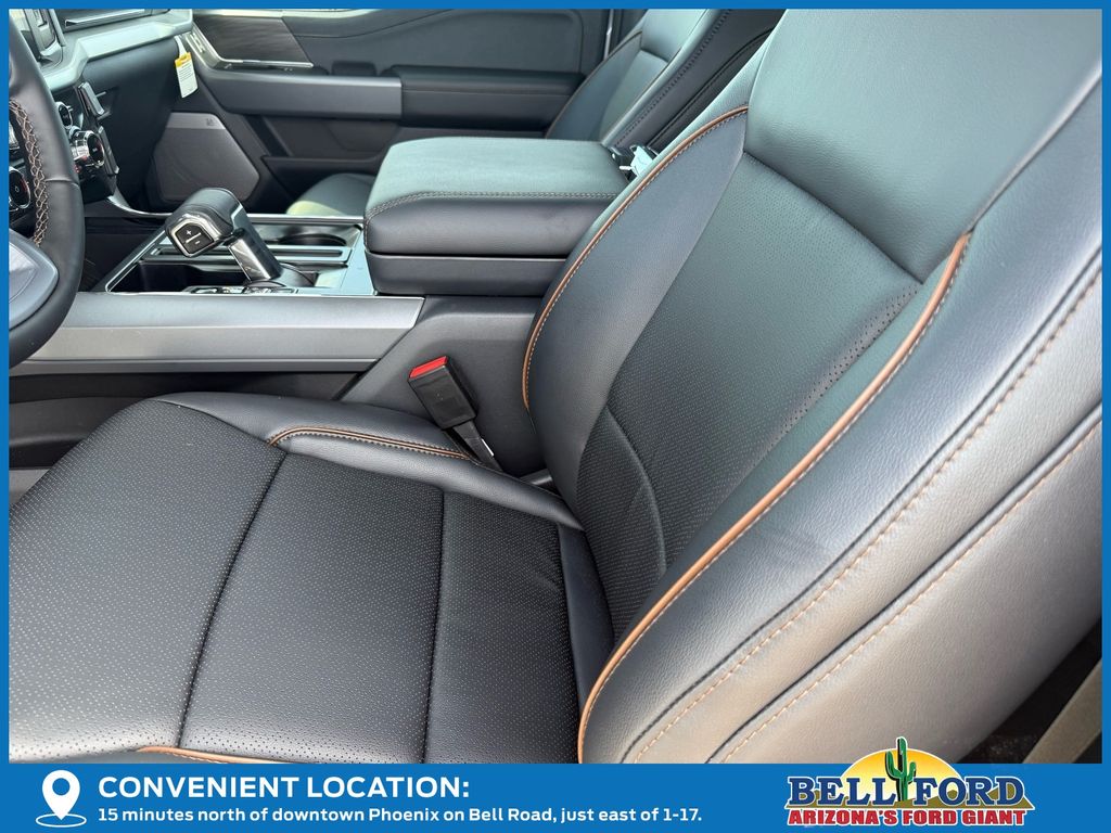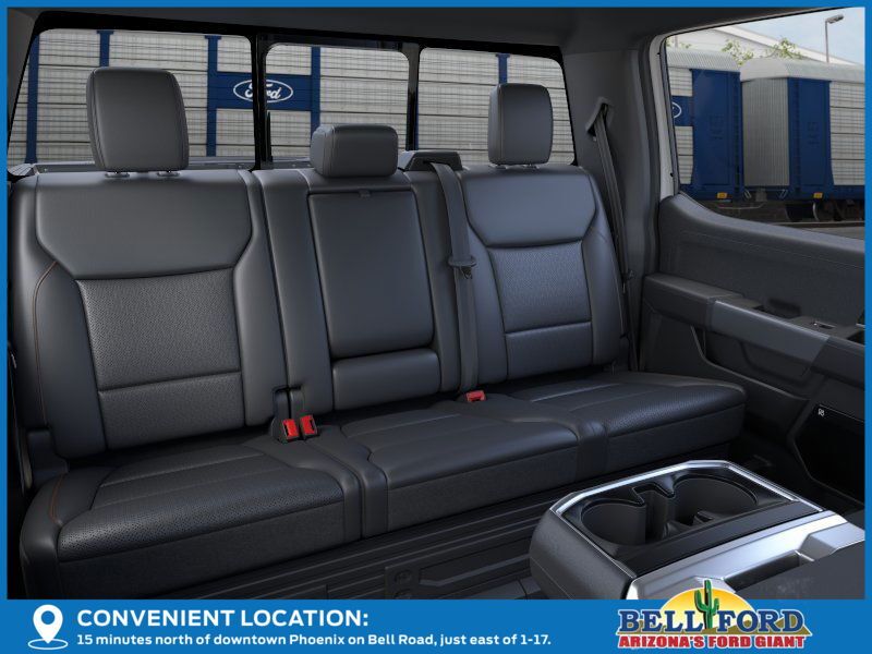 This Ford F-150 is equipped with the following options: Equipment Group 502A High (2nd Row Heated Seats, Ambient Lighting - Ice Blue Color Only, Heads-Up Display, Illuminated Driver & Passenger Visors, Power-Sliding Rear Window, Radio: B&O Unleashed Sound System by Bang & Olufsen, and Wheels: 20" Chrome-Like PVD), FX4 Off-Road Package (4x4 FX4 Off-Road Bodyside Decal, Hill Descent Control, Monotube Rear Shocks, Off-Road Tuned Front Shock Absorbers, Rock Crawl Mode, and Tray Style Floor Liner w/o Carpet Mats), Mobile Office Package (Console Worksurface, Partitioned Lockable Rear Storage, and Wireless Charging), Tow/Haul Package, 4WD, 4-Wheel Disc Brakes, 8 Speakers, ABS brakes, ActiveX Trimmed Bucket Seats, Adjustable pedals, Air Conditioning, Alloy wheels, AM/FM radio: SiriusXM with 360L, Auto High-beam Headlights, Auto-dimming door mirrors, Auto-dimming Rear-View mirror, Automatic temperature control, Brake assist, Bumpers: chrome, Chrome wheels, Compass, Delay-off headlights, Driver door bin, Driver vanity mirror, Dual front impact airbags, Dual front side impact airbags, Electronic Stability Control, Emergency communication system: SYNC 4 911 Assist, First Aid Kit w/Ford Logo, Front anti-roll bar, Front Bucket Seats, Front Center Armrest, Front dual zone A/C, Front fog lights, Front reading lights, Front wheel independent suspension, Fully automatic headlights, Garage door transmitter, Heated door mirrors, Heated front seats, Heated steering wheel, Illuminated entry, Internet access capable: FordPass Connect 5G, Low tire pressure warning, Memory seat, Navigation system: Connected Navigation, Occupant sensing airbag, Outside temperature display, Overhead airbag, Overhead console, Panic alarm, Passenger door bin, Passenger vanity mirror, Pedal memory, Power door mirrors, Power driver seat, Power passenger seat, Power steering, Power windows, Radio data system, Radio: B&O Sound System by Bang & Olufsen, Rain sensing wipers, Rear reading lights, Rear seat center armrest, Rear step bumper, Rear window defroster, Remote keyless entry, Security system, Speed control, Split folding rear seat, Steering wheel mounted audio controls, SYNC 4 w/Enhanced Voice Recognition, Tachometer, Telescoping steering wheel, Tilt steering wheel, Traction control, Trip computer, Turn signal indicator mirrors, Variably intermittent wipers, Ventilated front seats, Voltmeter, and Wheels: 18" Chrome-Like PVD.