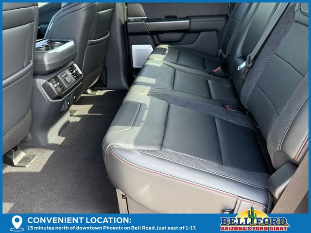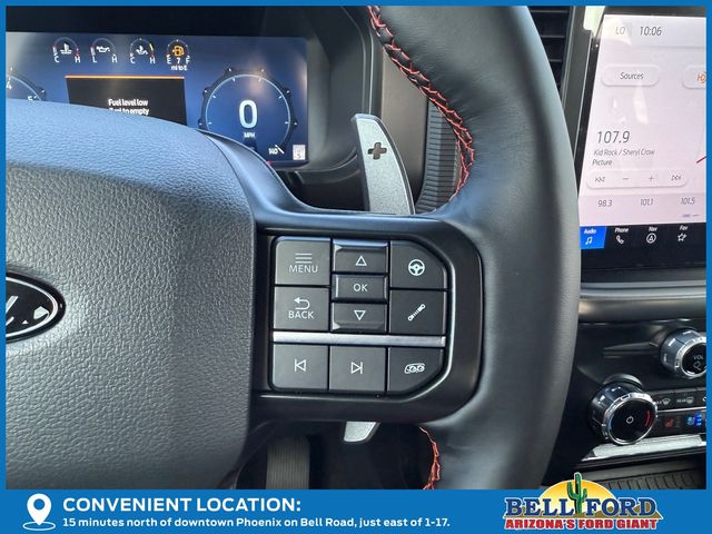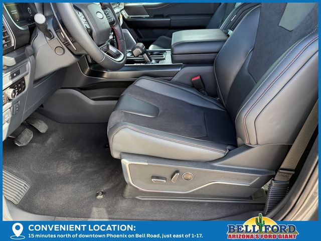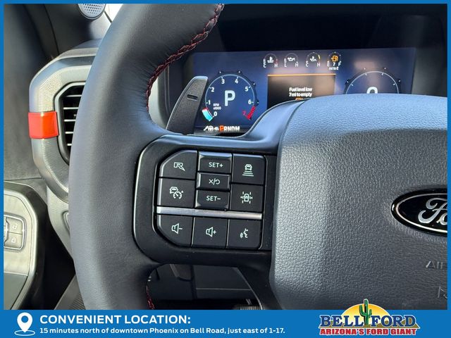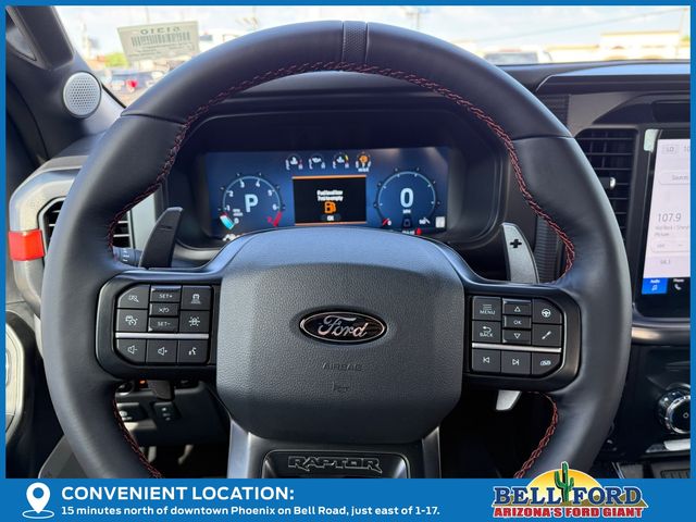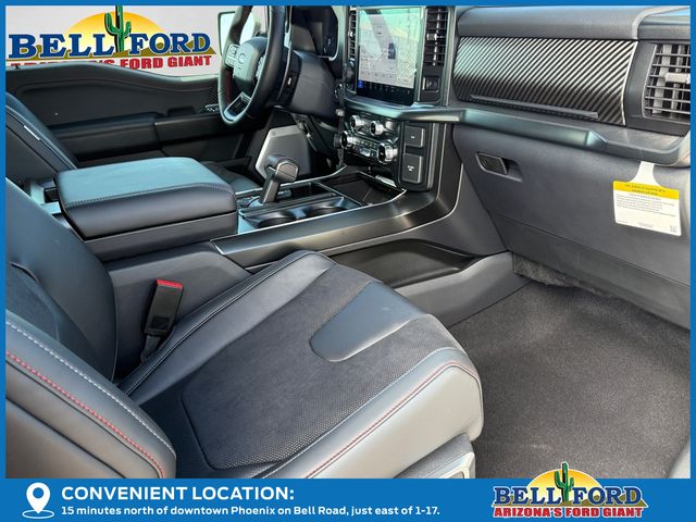 Equipment Group 802A Raptor 37 (Carbon Fiber Interior Appliques, Dual Valve Shocks, Modular Front Bumper, RECARO Alcantara Suede Front Seats, and Wheels: Raptor 37 Unique 17" Cast Aluminum), 4WD, 14 Speakers, 17" Cast Aluminum Wheels, 4-Wheel Disc Brakes, ABS brakes, Adjustable pedals, Air Conditioning, Alloy wheels, AM/FM radio: SiriusXM with 360L, Auto High-beam Headlights, Auto tilt-away steering wheel, Auto-dimming door mirrors, Auto-dimming Rear-View mirror, Automatic temperature control, Brake assist, Bumpers: body-color, Compass, Delay-off headlights, Driver door bin, Driver vanity mirror, Dual front impact airbags, Dual front side impact airbags, Electronic Locking w/4.10 Axle Ratio, Electronic Stability Control, Emergency communication system: SYNC 4 911 Assist, Front anti-roll bar, Front Bucket Seats, Front Center Armrest, Front dual zone A/C, Front fog lights, Front reading lights, Front wheel independent suspension, Fully automatic headlights, Garage door transmitter, Heads-Up Display, Heated door mirrors, Heated front seats, Heated rear seats, Heated steering wheel, Illuminated entry, Lane Departure Warning System, Leather steering wheel, Leather Trimmed Seats, Low tire pressure warning, Memory seat, Navigation system: Connected Navigation, Occupant sensing airbag, Outside temperature display, Overhead airbag, Overhead console, Panic alarm, Passenger door bin, Passenger vanity mirror, Pedal memory, Power door mirrors, Power driver seat, Power passenger seat, Power steering, Power windows, Radio data system, Radio: B&O Unleashed Sound System by Bang & Olufsen, Rain sensing wipers, Rear reading lights, Rear step bumper, Rear window defroster, Remote keyless entry, Security system, Speed control, Speed-sensing steering, Split folding rear seat, Steering wheel memory, Steering wheel mounted audio controls, SYNC 4 w/Enhanced Voice Recognition, Tachometer, Telescoping steering wheel, Tilt steering wheel, Traction control, Trip computer, Turn signal indicator mirrors, Twin Panel Moonroof, Variably intermittent wipers, and Ventilated front seats.
