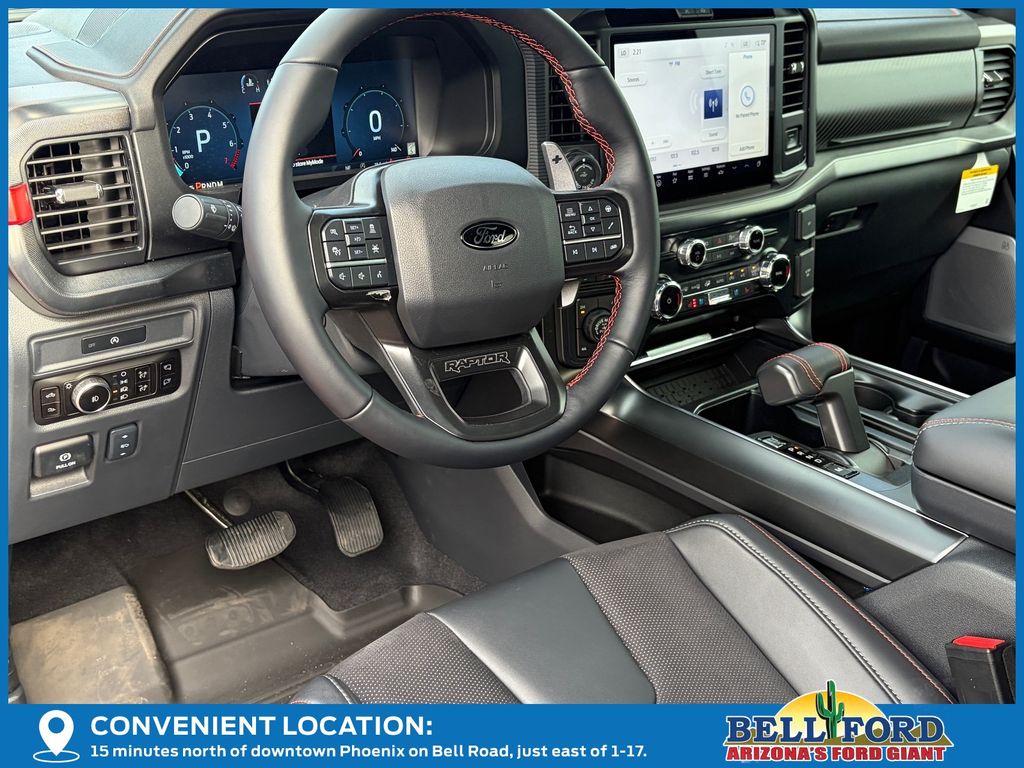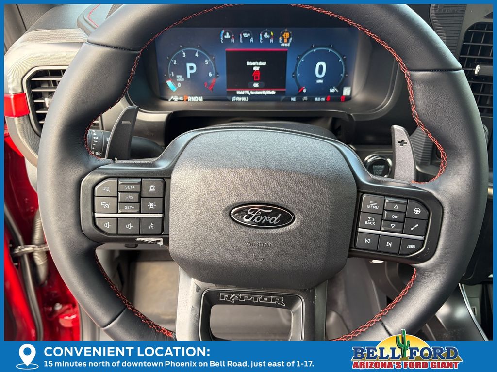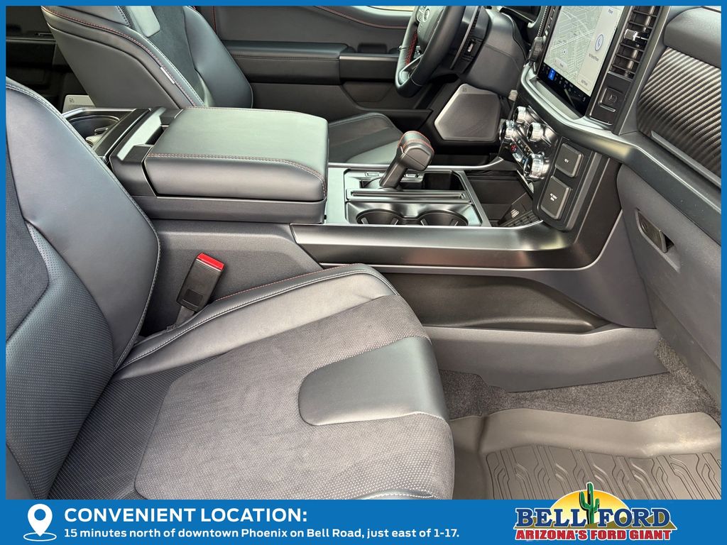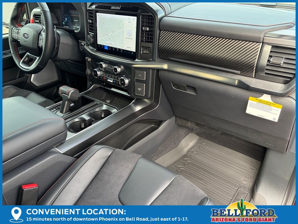 This Ford F-150 is equipped with the following options: Equipment Group 802A Raptor 37 (Carbon Fiber Interior Appliques, Dual Valve Shocks, Modular Front Bumper, RECARO Alcantara Suede Front Seats, and Wheels: Raptor 37 Unique 17" Cast Aluminum), 4WD, 14 Speakers, 17" Cast Aluminum Wheels, 4-Wheel Disc Brakes, ABS brakes, Adjustable pedals, Air Conditioning, Alloy wheels, AM/FM radio: SiriusXM with 360L, Auto High-beam Headlights, Auto tilt-away steering wheel, Auto-dimming door mirrors, Auto-dimming Rear-View mirror, Automatic temperature control, Brake assist, Bumpers: body-color, Compass, Delay-off headlights, Driver door bin, Driver vanity mirror, Dual front impact airbags, Dual front side impact airbags, Electronic Locking w/4.10 Axle Ratio, Electronic Stability Control, Emergency communication system: SYNC 4 911 Assist, Front anti-roll bar, Front Bucket Seats, Front Center Armrest, Front dual zone A/C, Front fog lights, Front License Plate Bracket, Front reading lights, Front wheel independent suspension, Fully automatic headlights, Garage door transmitter, Heads-Up Display, Heated door mirrors, Heated front seats, Heated rear seats, Heated steering wheel, Illuminated entry, Internet access capable: FordPass Connect 5G, Lane Departure Warning System, Leather steering wheel, Leather Trimmed Seats, Low tire pressure warning, Memory seat, Navigation system: Connected Navigation, Occupant sensing airbag, Outside temperature display, Overhead airbag, Overhead console, Panic alarm, Passenger door bin, Passenger vanity mirror, Pedal memory, Power door mirrors, Power driver seat, Power passenger seat, Power steering, Power windows, Radio data system, Radio: B&O Unleashed Sound System by Bang & Olufsen, Rain sensing wipers, Rear reading lights, Rear step bumper, Rear window defroster, Remote keyless entry, SecuriCode Keyless-Entry Keypad, Security system, Speed control, Speed-sensing steering, Split folding rear seat, Steering wheel memory, Steering wheel mounted audio controls, SYNC 4 w/Enhanced Voice Recognition, Tachometer, Telescoping steering wheel, Tilt steering wheel, Traction control, Trip computer, Turn signal indicator mirrors, Variably intermittent wipers, and Ventilated front seats.
