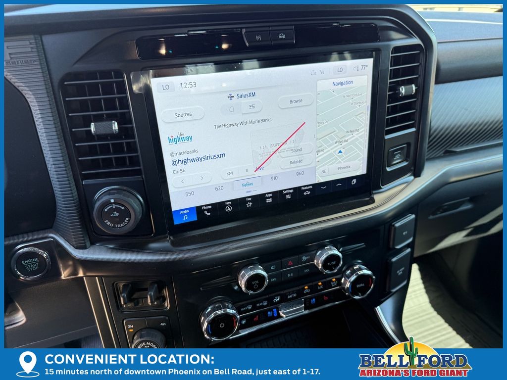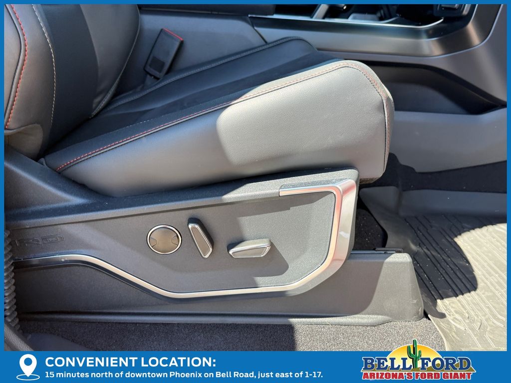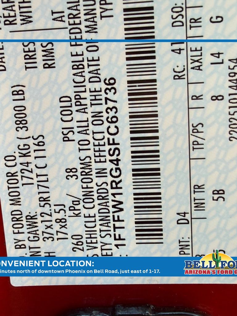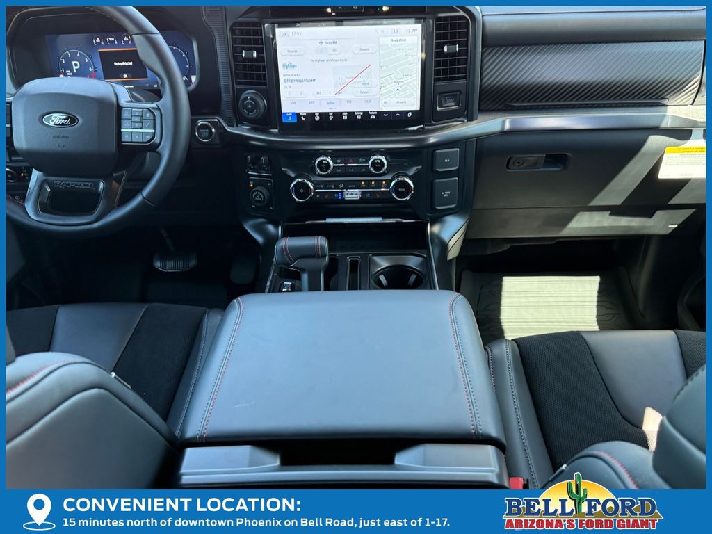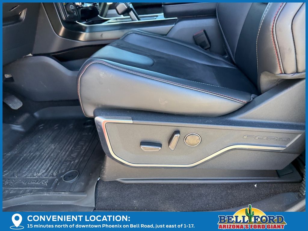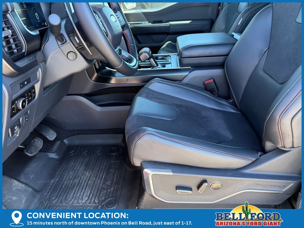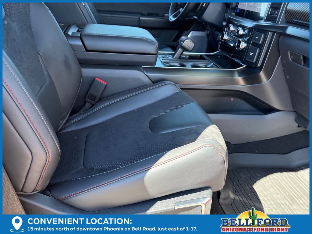 This Ford F-150 is equipped with the following options: Equipment Group 802A Raptor 37 (Carbon Fiber Interior Appliques, Dual Valve Shocks, Modular Front Bumper, RECARO Alcantara Suede Front Seats, and Wheels: Raptor 37 Unique 17" Cast Aluminum), 4WD, 14 Speakers, 17" Cast Aluminum Wheels, 4-Wheel Disc Brakes, ABS brakes, Adjustable pedals, Air Conditioning, Alloy wheels, AM/FM radio: SiriusXM with 360L, Auto High-beam Headlights, Auto tilt-away steering wheel, Auto-dimming door mirrors, Auto-dimming Rear-View mirror, Automatic temperature control, Brake assist, Bumpers: body-color, Compass, Delay-off headlights, Driver door bin, Driver vanity mirror, Dual front impact airbags, Dual front side impact airbags, Electronic Locking w/4.10 Axle Ratio, Electronic Stability Control, Emergency communication system: SYNC 4 911 Assist, Engine Block Heater, Front anti-roll bar, Front Bucket Seats, Front Center Armrest, Front dual zone A/C, Front fog lights, Front License Plate Bracket, Front reading lights, Front wheel independent suspension, Fully automatic headlights, Garage door transmitter, Heads-Up Display, Heated door mirrors, Heated front seats, Heated rear seats, Heated steering wheel, Illuminated entry, Internet access capable: FordPass Connect 5G, Lane Departure Warning System, Leather steering wheel, Leather Trimmed Seats, Low tire pressure warning, Memory seat, Navigation system: Connected Navigation, Occupant sensing airbag, Outside temperature display, Overhead airbag, Overhead console, Panic alarm, Passenger door bin, Passenger vanity mirror, Pedal memory, Power door mirrors, Power driver seat, Power passenger seat, Power steering, Power windows, Radio data system, Radio: B&O Unleashed Sound System by Bang & Olufsen, Rain sensing wipers, Rear reading lights, Rear step bumper, Rear window defroster, Remote keyless entry, Security system, Speed control, Speed-sensing steering, Split folding rear seat, Steering wheel memory, Steering wheel mounted audio controls, SYNC 4 w/Enhanced Voice Recognition, Tachometer, Telescoping steering wheel, Tilt steering wheel, Tough Bed Spray-In Bedliner, Traction control, Trip computer, Turn signal indicator mirrors, Variably intermittent wipers, and Ventilated front seats.