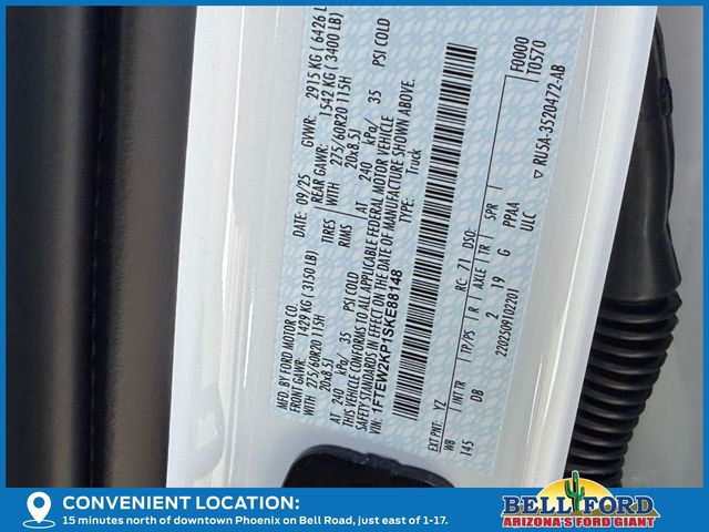 Equipment Group 200A Mid (LED Fog Lamps w/LED Cornering Lamp and Wheels: 20" Dark Gray w/Machined Aluminum), GVWR: 6,426 lbs Payload Package, 3.55 Axle Ratio, 4-Wheel Disc Brakes, 6 Speakers, ABS brakes, Air Conditioning, Alloy wheels, AM/FM radio: SiriusXM with 360L, Auto High-beam Headlights, Brake assist, Bumpers: body-color, Compass, Delay-off headlights, Driver door bin, Dual front impact airbags, Dual front side impact airbags, Electronic Stability Control, Emergency communication system: SYNC 4 911 Assist, Front anti-roll bar, Front Bucket Seats, Front Center Armrest, Front reading lights, Front wheel independent suspension, Fully automatic headlights, Heated door mirrors, Illuminated entry, Low tire pressure warning, Occupant sensing airbag, Outside temperature display, Overhead airbag, Overhead console, Panic alarm, Passenger door bin, Passenger vanity mirror, Power door mirrors, Power steering, Power windows, Radio data system, Radio: AM/FM Stereo w/SiriusXM 360L, Rear Parking Sensors, Rear step bumper, Rear window defroster, Remote keyless entry, Security system, Speed control, Split folding rear seat, Steering wheel mounted audio controls, SYNC 4 w/Enhanced Voice Recognition, Tachometer, Telescoping steering wheel, Tilt steering wheel, Traction control, Trip computer, Variably intermittent wipers, Voltmeter, and Wheels: 18" Gloss Black. Price includes: $1250 - Retail Bonus Cash. Exp. 01/05/2026