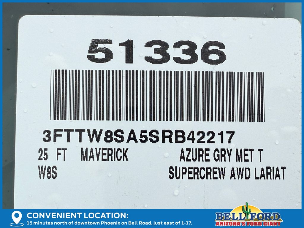 This Ford Maverick is equipped with the following options: Equipment Group 502A, 2.91 Axle Ratio, 4-Wheel Disc Brakes, 8 Speakers, ABS brakes, ActiveX Trimmed Heated Front Bucket Seats, Air Conditioning, Alloy wheels, AM/FM radio: SiriusXM with 360L, Apple CarPlay/Android Auto, Auto High-beam Headlights, Automatic temperature control, Brake assist, Bumpers: body-color, Compass, Delay-off headlights, Driver door bin, Driver vanity mirror, Dual front impact airbags, Dual front side impact airbags, Electronic Stability Control, Emergency communication system: SYNC 4 911 Assist, Exterior Parking Camera Rear, Four wheel independent suspension, Front anti-roll bar, Front Bucket Seats, Front Center Armrest, Front dual zone A/C, Front reading lights, Fully automatic headlights, Heated door mirrors, Heated front seats, Heated steering wheel, Illuminated entry, Internet access capable: FordPass Connect 5G, Knee airbag, Low tire pressure warning, Navigation system: Connected Navigation, Occupant sensing airbag, Outside temperature display, Overhead airbag, Overhead console, Panic alarm, Passenger door bin, Passenger vanity mirror, Power door mirrors, Power driver seat, Power steering, Power windows, Radio data system, Radio: B&O Sound System by Bang & Olufsen, Rear anti-roll bar, Rear seat center armrest, Rear step bumper, Remote keyless entry, Security system, SiriusXM w/360L, Speed control, Speed-sensing steering, Steering wheel mounted audio controls, SYNC 4 w/Enhanced Voice Recognition, Telescoping steering wheel, Tilt steering wheel, Traction control, Trip computer, and Wheels: 19" Machined Painted Aluminum. Price includes: $1000 - Final Days Mega Bonus Cash. Exp. 01/02/2026 $1000 - Retail Customer Cash. Exp. 12/17/2025
