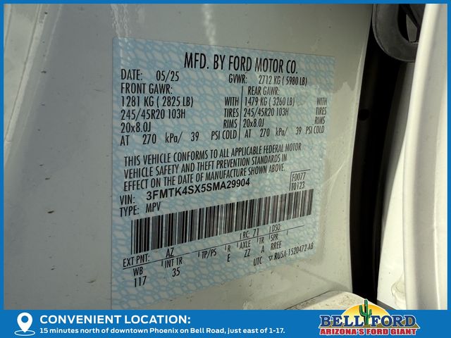 Equipment Group 400A Standard Package, 10 Speakers, 4-Wheel Disc Brakes, ABS brakes, Adaptive suspension, Air Conditioning, Alloy wheels, AM/FM radio: SiriusXM with 360L, Apple CarPlay/Android Auto, Auto High-beam Headlights, Auto-dimming Rear-View mirror, Automatic temperature control, Brake assist, Bumpers: body-color, Compass, Delay-off headlights, Driver door bin, Driver vanity mirror, Dual front impact airbags, Dual front side impact airbags, Electronic Stability Control, Emergency communication system: 911 Assist, Exterior Parking Camera Rear, Four wheel independent suspension, Front anti-roll bar, Front Bucket Seats, Front Center Armrest, Front dual zone A/C, Front reading lights, Fully automatic headlights, Garage door transmitter, Heated door mirrors, Heated front seats, Heated Perforated ActiveX Performance Seats, Heated steering wheel, Hood & Decklid Stripe/Door Graphics Delete, Illuminated entry, Knee airbag, Low tire pressure warning, Memory seat, Mobile Power Cord (120V/240V), Navigation system: Connected Navigation, Occupant sensing airbag, Outside temperature display, Overhead airbag, Overhead console, Panic alarm, Panoramic Fixed-Glass Roof, Passenger door bin, Passenger vanity mirror, Power door mirrors, Power driver seat, Power Liftgate, Power passenger seat, Power steering, Power windows, Radio data system, Radio: B&O Sound System by Bang & Olufsen, Rain sensing wipers, Rear anti-roll bar, Rear seat center armrest, Rear side impact airbag, Rear window defroster, Rear window wiper, Remote keyless entry, Security system, SiriusXM w/360L, Speed control, Speed-sensing steering, Speed-Sensitive Wipers, Split folding rear seat, Spoiler, Steering wheel mounted audio controls, SYNC 4A w/Enhanced Voice Recognition, Telescoping steering wheel, Tilt steering wheel, Traction control, Trip computer, Turn signal indicator mirrors, Variably intermittent wipers, Wheels: 20" Machined Face Aluminum, and Wheels: 20" Monochromatic High Gloss Black-Painted.