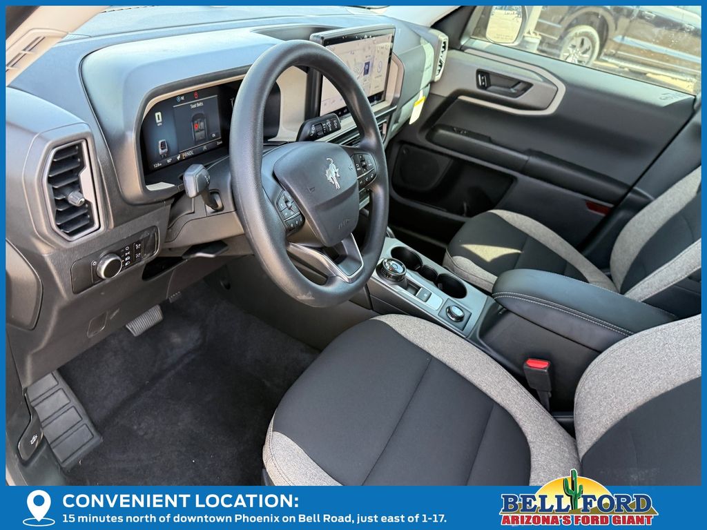 This Ford Bronco Sport is equipped with the following options: Equipment Group 200A Standard Package (AM/FM Stereo, Cloth with Easy-to-Clean Front Bucket Seats, SiriusXM with 360L, SYNC 4 with Enhanced Voice Recognition, and Wheels: 17" Carbonized Gray Painted Aluminum), Ford Connectivity Package (1-Year Included), Internet access capable: 5G Modem - Ford Connectivity Package, 4-Wheel Disc Brakes, 6 Speakers, ABS brakes, Air Conditioning, Alloy wheels, AM/FM radio: SiriusXM with 360L, Apple CarPlay/Android Auto, Auto High-beam Headlights, Automatic temperature control, Brake assist, Compass, Delay-off headlights, Driver door bin, Driver vanity mirror, Dual front impact airbags, Dual front side impact airbags, Electronic Stability Control, Emergency communication system: SYNC 4 911 Assist, Exterior Parking Camera Rear, Four wheel independent suspension, Front anti-roll bar, Front Bucket Seats, Front Center Armrest, Front reading lights, Fully automatic headlights, Heated door mirrors, Illuminated entry, Knee airbag, Low tire pressure warning, Occupant sensing airbag, Outside temperature display, Overhead airbag, Overhead console, Panic alarm, Passenger door bin, Passenger vanity mirror, Power door mirrors, Power steering, Power windows, Radio data system, Rear anti-roll bar, Rear Parking Sensors, Rear reading lights, Rear seat center armrest, Rear window defroster, Rear window wiper, Remote keyless entry, Security system, Speed control, Speed-sensing steering, Speed-Sensitive Wipers, Split folding rear seat, Steering wheel mounted audio controls, Tachometer, Telescoping steering wheel, Tilt steering wheel, Traction control, Trip computer, Variably intermittent wipers, and Wheels: 17" Carbonized Gray-Painted Aluminum.