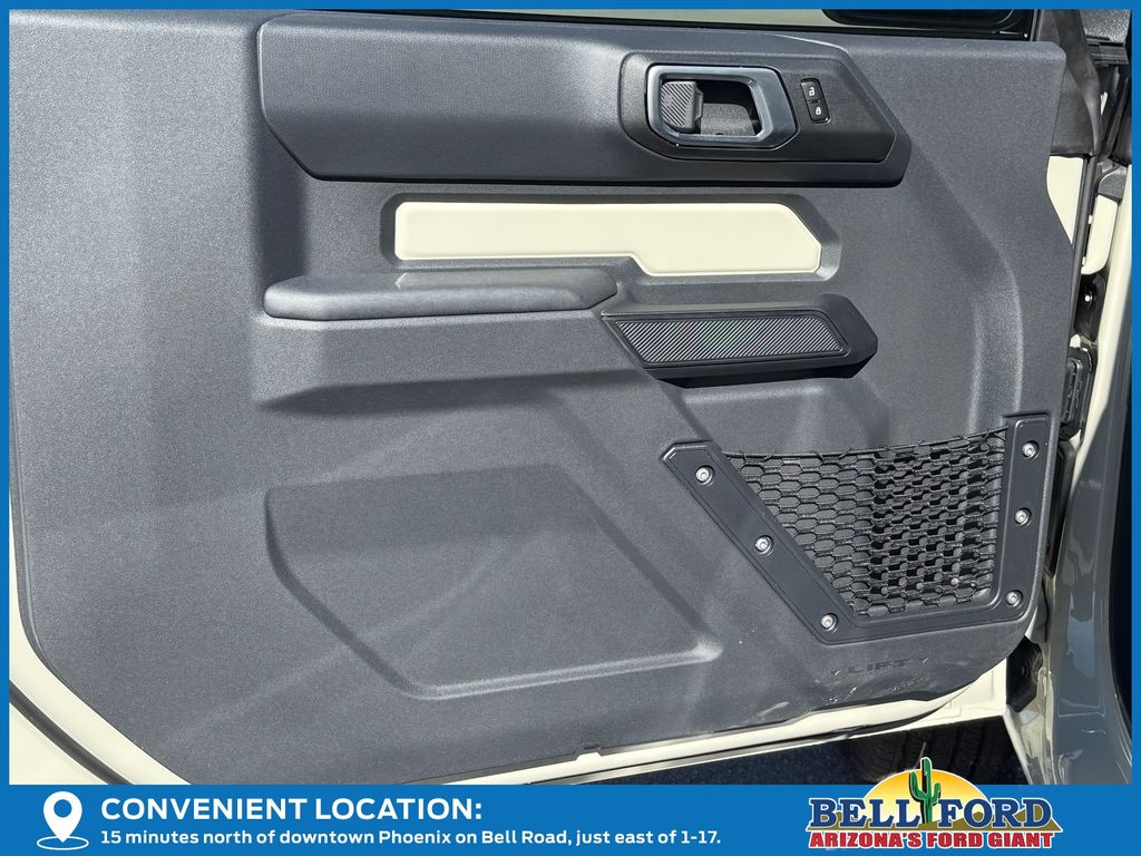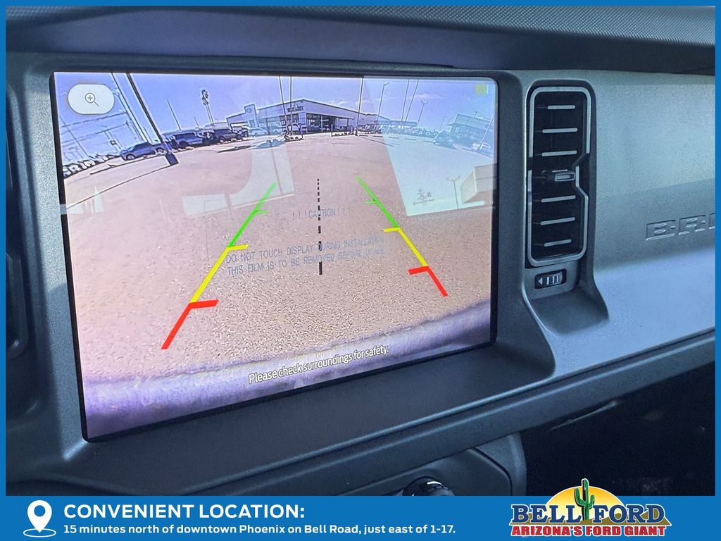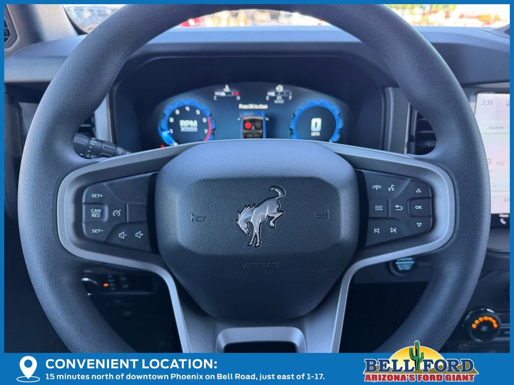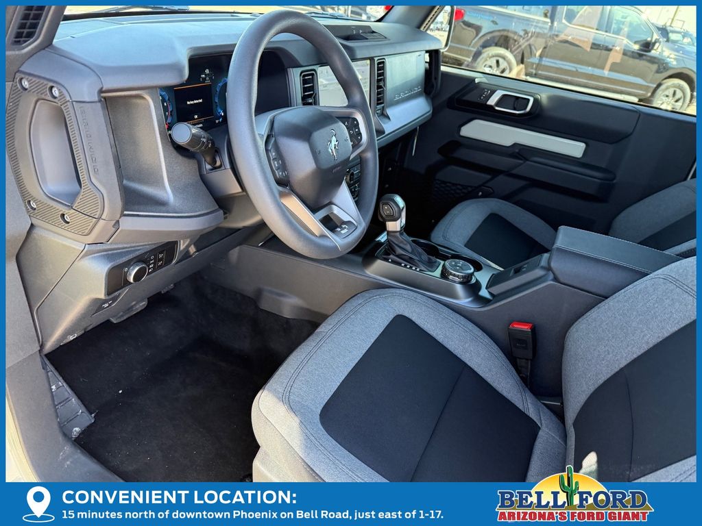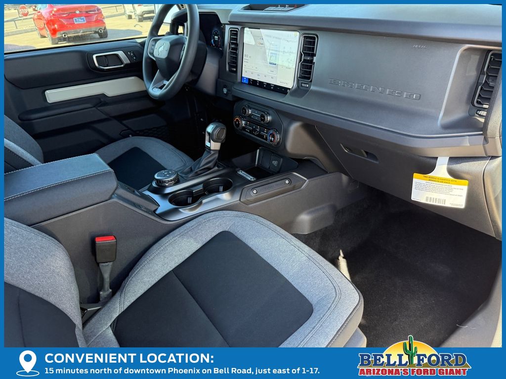 This Ford Bronco is equipped with the following options: Equipment Group 101A (4.46 Axle Ratio, AM/FM Stereo, Cloth Bucket Seats, SiriusXM with 360L, SYNC 4, and Wheels: 16" Bright Polished Silver-Painted Steel), Ford Connectivity Package (1-Year Included), 4-Wheel Disc Brakes, 7 Speakers, ABS brakes, Air Conditioning, AM/FM radio: SiriusXM with 360L, Auto High-beam Headlights, Brake assist, Compass, Convertible HardTop, Convertible roof lining, Delay-off headlights, Driver door bin, Driver vanity mirror, Dual front impact airbags, Dual front side impact airbags, Electronic Stability Control, Emergency communication system: 911 Assist, Exterior Parking Camera Rear, Front anti-roll bar, Front Bucket Seats, Front Center Armrest, Front reading lights, Front wheel independent suspension, Fully automatic headlights, Glass rear window, Heated door mirrors, Illuminated entry, Integrated roll-over protection, Low tire pressure warning, Occupant sensing airbag, Outside temperature display, Overhead airbag, Overhead console, Panic alarm, Passenger door bin, Passenger vanity mirror, Power door mirrors, Power steering, Power windows, Radio data system, Rear window defroster, Rear window wiper, Remote keyless entry, Security system, Speed control, Split folding rear seat, Steering wheel mounted audio controls, Tachometer, Telescoping steering wheel, Tilt steering wheel, Traction control, Trip computer, and Variably intermittent wipers.