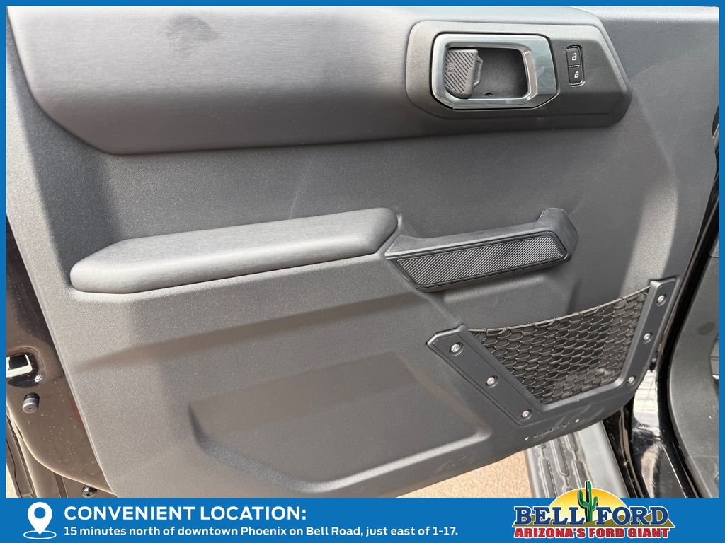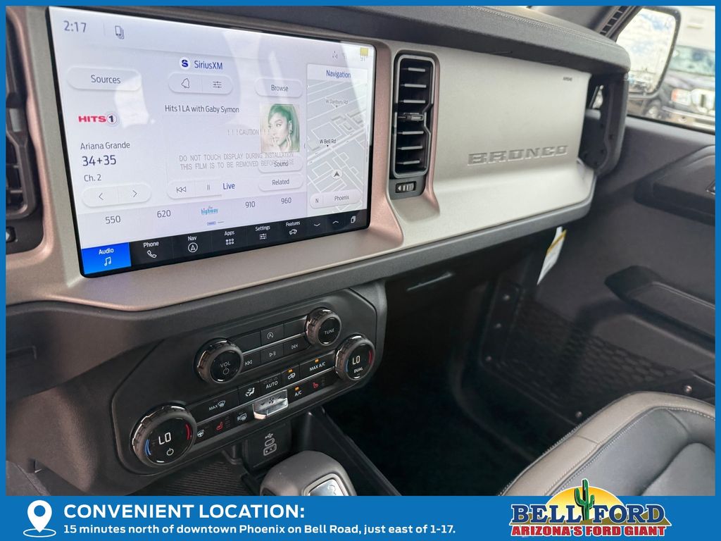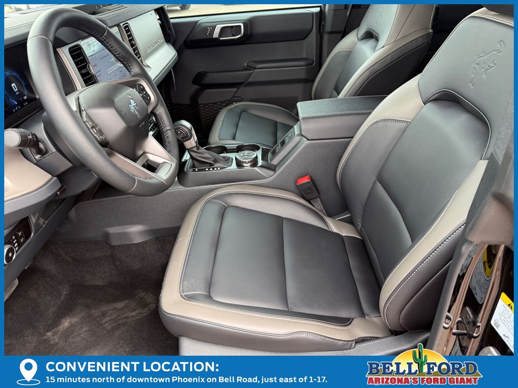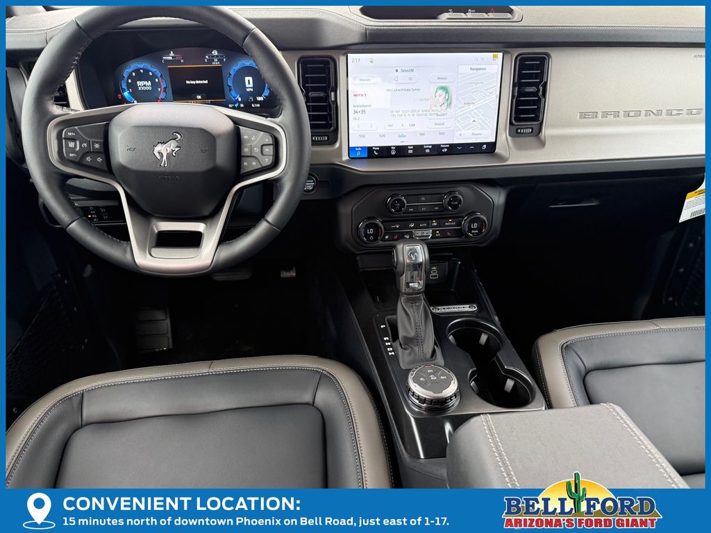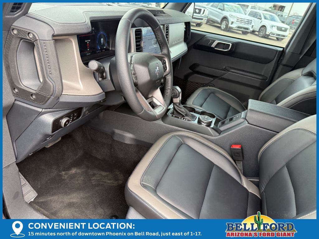 This Ford Bronco is equipped with the following options: Equipment Group 312A Mid Package (18" Bright Machined Aluminum Wheels, 3.73 Axle Ratio, AM/FM Stereo, Connected Navigation, Heated Leather-Trimmed/Vinyl Bucket Seats, SiriusXM with 360L, and SYNC 4), Ford Connectivity Package (1-Year Included), 4-Wheel Disc Brakes, 7 Speakers, ABS brakes, Air Conditioning, Alloy wheels, AM/FM radio: SiriusXM with 360L, Auto High-beam Headlights, Auto-dimming Rear-View mirror, Automatic temperature control, Brake assist, Carbonized Gray Molded-in-Color Hard Top, Compass, Delay-off headlights, Driver door bin, Driver vanity mirror, Dual front impact airbags, Dual front side impact airbags, Electronic Stability Control, Emergency communication system: 911 Assist, Exterior Parking Camera Rear, Front anti-roll bar, Front Bucket Seats, Front Center Armrest, Front dual zone A/C, Front fog lights, Front reading lights, Front wheel independent suspension, Fully automatic headlights, Hard Top Sound Deadening Headliner, Heated door mirrors, Heated front seats, Heated steering wheel, Illuminated entry, Integrated roll-over protection, Leather Shift Knob, Low tire pressure warning, Navigation system: Connected Navigation, Occupant sensing airbag, Outside temperature display, Overhead airbag, Overhead console, Panic alarm, Passenger door bin, Passenger vanity mirror, Power door mirrors, Power driver seat, Power passenger seat, Power steering, Power windows, Radio data system, Rear seat center armrest, Rear-Window Defroster and Washer, Remote keyless entry, Security system, Speed control, Split folding rear seat, Steering wheel mounted audio controls, Tachometer, Telescoping steering wheel, Tilt steering wheel, Traction control, Trip computer, Variably intermittent wipers, and Voltmeter. Price includes: $750 - Retail Customer Cash. Exp. 04/30/2026