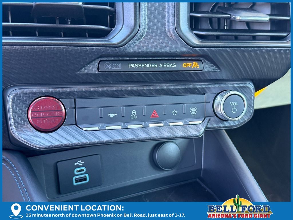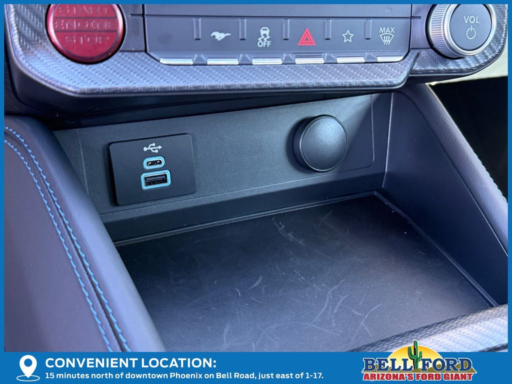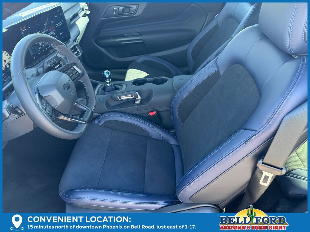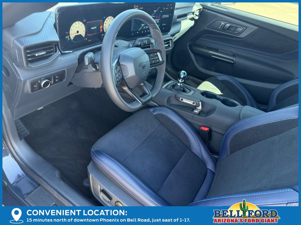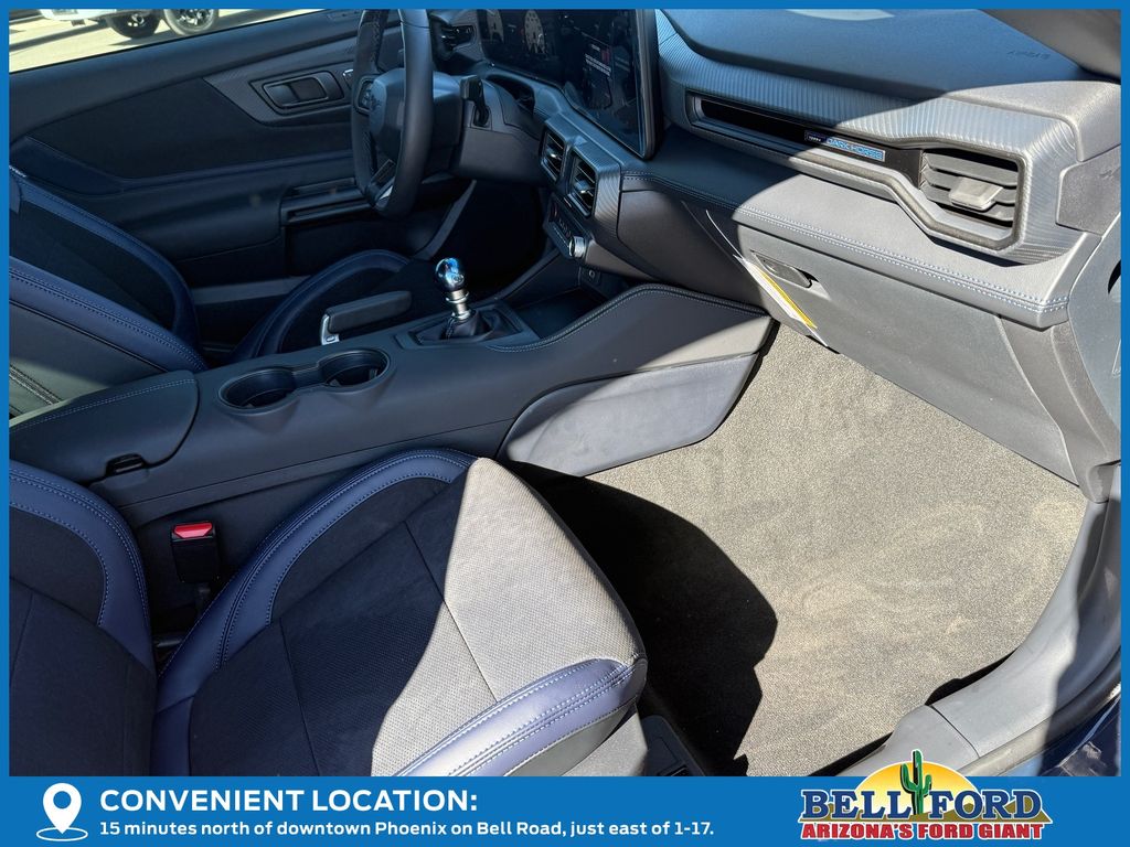 This Ford Mustang is equipped with the following options: Anti-Theft Package (Active Anti-Theft System, Locking Center Console, and Wheel Locking Kit), Dark Horse Appearance Package (Notorious Blue Painted Unique Brake Calipers, Painted Black Roof, and Unique Hood Graphic), Equipment Group 700A Deluxe Package (Aluminum Foot Pedals, AM/FM Stereo, Approach Detection, B&O Sound System by Bang & Olufsen, Cloth/Vinyl Climate-Controlled Bucket Seats, Driver Seat Memory with 3 Settings, HD Radio, SiriusXM with 360L, SYNC 4, and Wheels: 19" x 9.5" Front & 19" x 10" Rear Aluminum), 12 Speakers, 4-Wheel Disc Brakes, ABS brakes, Adaptive suspension, Air Conditioning, Alloy wheels, AM/FM radio: SiriusXM with 360L, Auto High-beam Headlights, Auto-dimming Rear-View mirror, Automatic temperature control, Brake assist, Bumpers: body-color, Cloth/Vinyl Heated Bucket Seats, Compass, Delay-off headlights, Driver door bin, Driver vanity mirror, Dual front impact airbags, Dual front side impact airbags, Electronic Stability Control, Emergency communication system: 911 Assist, Exterior Parking Camera Rear, Four wheel independent suspension, Front anti-roll bar, Front Bucket Seats, Front Center Armrest, Front dual zone A/C, Front reading lights, Fully automatic headlights, Heated front seats, Heated steering wheel, Illuminated entry, Knee airbag, Low tire pressure warning, Navigation system: Connected Navigation, Occupant sensing airbag, Outside temperature display, Overhead airbag, Overhead console, Panic alarm, Passenger door bin, Passenger vanity mirror, Power door mirrors, Power driver seat, Power passenger seat, Power steering, Power windows, Radio data system, Rain sensing wipers, Rear anti-roll bar, Rear Parking Sensors, Rear window defroster, Remote keyless entry, Speed control, Speed-sensing steering, Speed-Sensitive Wipers, Split folding rear seat, Spoiler, Sport steering wheel, Steering wheel mounted audio controls, Tachometer, Telescoping steering wheel, Tilt steering wheel, Traction control, Trip computer, Variably intermittent wipers, and Voltmeter.