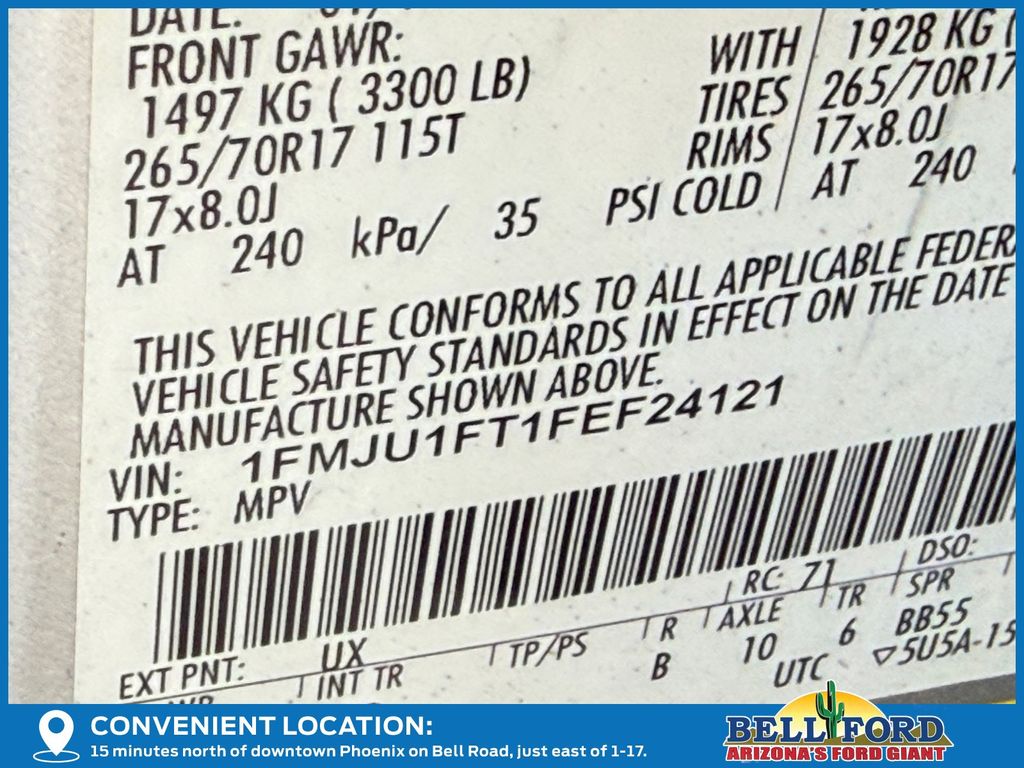 ** HERE AT BELL FORD ITS ALL ABOUT THE EXPERIENCE** Please visit us online at www.bellford.com This Ford Expedition is equipped with the following options: Equipment Group 101A (DISC) (3rd Row 60/40 Cloth Manual Bench Seat, AM/FM Single CD, Compass, Electronic Air Temperature Control (EATC), Progressive Range Select, SiriusXM Satellite Radio, and SYNC Communications & Entertainment System), GVWR: 7,300 lbs Payload Package, Heavy-Duty Trailer-Tow Package (Heavy-Duty Auxiliary Transmission Oil Cooler, Heavy-Duty Radiator, and Integrated Trailer Brake Controller), 17" Painted Aluminum Wheels, 3.15 Axle Ratio, 4-Wheel Disc Brakes, 6 Speakers, ABS brakes, Air Conditioning, Alloy wheels, AM/FM radio, Auto-dimming Rear-View mirror, Brake assist, CD player, Cloth Front Bucket Seats, Delay-off headlights, Driver door bin, Driver vanity mirror, Dual front impact airbags, Dual front side impact airbags, Electronic Stability Control, Exterior Parking Camera Rear, Four wheel independent suspension, Front anti-roll bar, Front Bucket Seats, Front Center Armrest, Front fog lights, Front reading lights, Fully automatic headlights, Heated door mirrors, Illuminated entry, Leather steering wheel, Low tire pressure warning, Occupant sensing airbag, Outside temperature display, Overhead airbag, Overhead console, Panic alarm, Passenger door bin, Passenger vanity mirror, Power door mirrors, Power driver seat, Power steering, Power windows, Radio data system, Radio: AM/FM Single CD Player, Rear air conditioning, Rear anti-roll bar, Rear audio controls, Rear reading lights, Rear window defroster, Rear window wiper, Remote keyless entry, Roof rack, Security system, Speed control, Speed-sensing steering, Speed-Sensitive Wipers, Split folding rear seat, Tachometer, Telescoping steering wheel, Tilt steering wheel, Traction control, Variably intermittent wipers, and VoltmeteR.