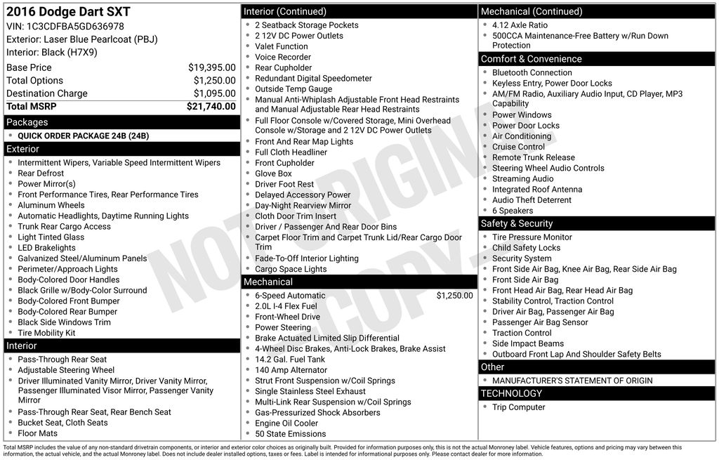 B5 Blue Pearlcoat 2016 Dodge Dart SXT FWD 6-Speed Automatic 2.0L I4 DOHC