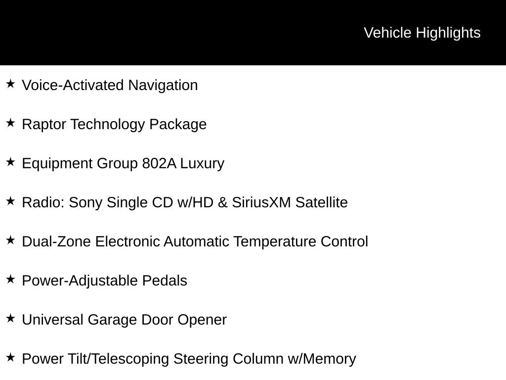 This Raptor's impressive capabilities are further enhanced by the Raptor Technology Package, which includes Auto High Beam, rain-sensing wipers, Lane-Keeping System, and Adaptive Cruise Control with Collision Mitigation. The twin-panel moonroof adds an open-air experience, while the SYNC 3 infotainment system and premium audio keep you connected and entertained.