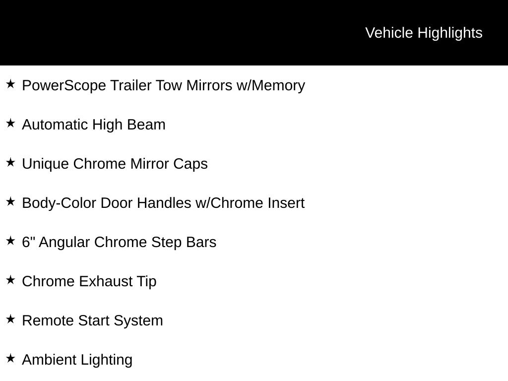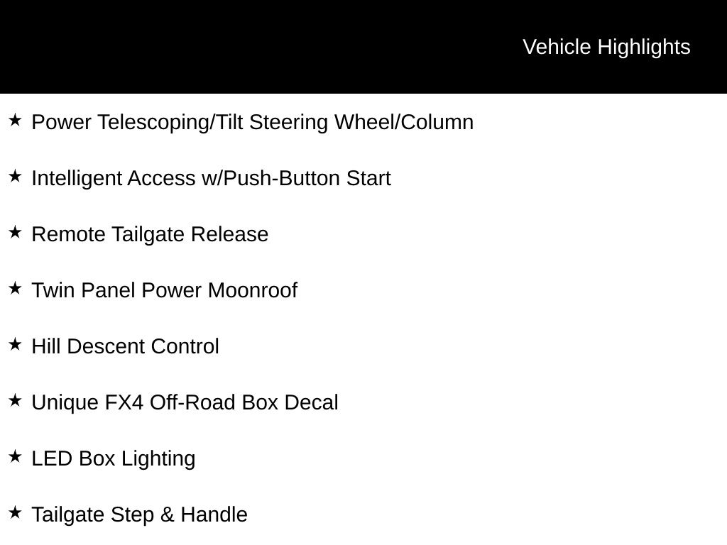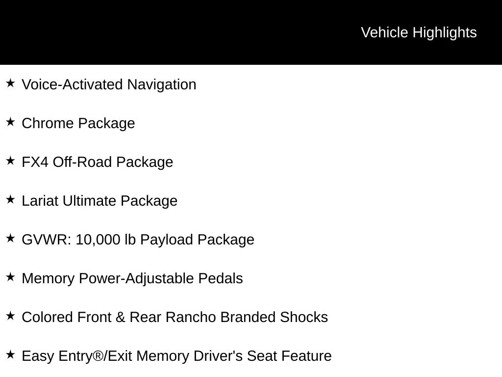 4WD, 6" Angular Chrome Step Bars, Ambient Lighting, Automatic High Beam, Body-Color Door Handles w/Chrome Insert, Chrome Exhaust Tip, Chrome Package, Colored Front & Rear Rancho Branded Shocks, Easy Entry/Exit Memory Driver's Seat Feature, FX4 Off-Road Package, GVWR: 10,000 lb Payload Package, Hill Descent Control, Intelligent Access w/Push-Button Start, Lariat Ultimate Package, LED Box Lighting, Memory Power-Adjustable Pedals, Power Heated/Cooled Driver Seat w/Memory, Power Heated/Cooled Passenger Seat, Power Telescoping/Tilt Steering Wheel/Column, PowerScope Trailer Tow Mirrors w/Memory, Remote Start System, Remote Tailgate Release, Tailgate Step & Handle, Twin Panel Power Moonroof, Unique Chrome Mirror Caps, Unique FX4 Off-Road Box Decal, Voice-Activated Navigation, Wheels: 18" Chrome PVD Aluminum.