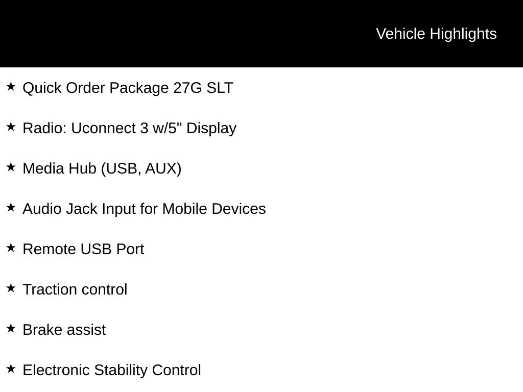 17" x 7" Aluminum Wheels, 40/20/40 Split Bench Seat, Audio Jack Input for Mobile Devices, Brake assist, Electronic Stability Control, Media Hub (USB, AUX), Quick Order Package 27G SLT, Radio: Uconnect 3 w/5" Display, Remote USB Port, Speed control, Traction control.