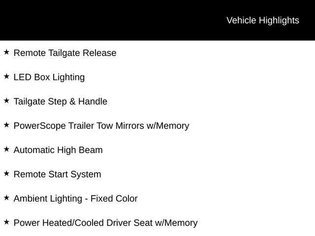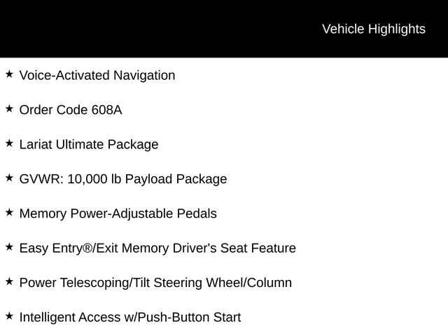 4WD, Ambient Lighting - Fixed Color, Automatic High Beam, Easy Entry/Exit Memory Driver's Seat Feature, GVWR: 10,000 lb Payload Package, Intelligent Access w/Push-Button Start, Lariat Ultimate Package, LED Box Lighting, Memory Power-Adjustable Pedals, Order Code 608A, Power Heated/Cooled Driver Seat w/Memory, Power Heated/Cooled Passenger Seat, Power Telescoping/Tilt Steering Wheel/Column, PowerScope Trailer Tow Mirrors w/Memory, Remote Start System, Remote Tailgate Release, Tailgate Step & Handle, Voice-Activated Navigation.