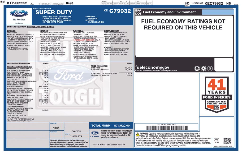 ** HERE AT BELL FORD ITS ALL ABOUT THE EXPERIENCE** Please visit us online at www.bellford.com This Ford F-350SD is equipped with the following options: FX4 Off-Road Package (Hill Descent Control, Off-Road Specifically Tuned Shock Absorbers, and Unique FX4 Off-Road Box Decal), GVWR: 11,300 lb Payload Package, Lariat Ultimate Package (Ambient Lighting - Fixed Color, Automatic High Beam, Easy Entry/Exit Memory Driver's Seat Feature, Intelligent Access w/Push-Button Start, LED Box Lighting, Memory Power-Adjustable Pedals, Power Heated/Cooled Driver Seat w/Memory, Power Heated/Cooled Passenger Seat, Power Telescoping/Tilt Steering Wheel/Column, PowerScope Trailer Tow Mirrors w/Memory, Remote Start System, Remote Tailgate Release, Tailgate Step & Handle, and Voice-Activated Navigation), Order Code 618A, Tow Technology Bundle (Adaptive Steering, Lane-Keeping Alert, Rear CHMSL Camera, and Ultimate Trailer Tow Camera System), 4WD, 10 Speakers, 110V/400W Outlet, 3.73 Axle Ratio, 4-Wheel Disc Brakes, 6" Angular Chrome Extended Running Boards, ABS brakes, Adjustable pedals, Air Conditioning, Alloy wheels, AM/FM radio: SiriusXM, AppLink/Apple CarPlay and Android Auto, Auto-dimming Rear-View mirror, Automatic temperature control, BLIS Blind Spot Information System, Brake assist, Bumpers: chrome, Compass, Delay-off headlights, Driver door bin, Driver vanity mirror, Dual front impact airbags, Dual front side impact airbags, Electronic Stability Control, Emergency communication system: SYNC 3 911 Assist, Exterior Parking Camera Rear, Flow-Through Console, Front anti-roll bar, Front Bucket Seats, Front Center Armrest, Front dual zone A/C, Front fog lights, Front Leather Seating Surfaces 40/Console/40, Front reading lights, Fully automatic headlights, Heated door mirrors, Illuminated entry, Leather steering wheel, Low tire pressure warning, Outside temperature display, Overhead airbag, Overhead console, Panic alarm, Passenger door bin, Passenger vanity mirror, Power door mirrors, Power driver seat, Power passenger seat, Power steering, Power windows, Radio data system, Radio: B&O Sound System by Bang & Olufsen, Rear Parking Sensors, Rear reading lights, Rear seat center armrest, Rear step bumper, Rear window defroster, Remote keyless entry, Security system, SiriusXM Radio, Speed control, Split folding rear seat, Steering wheel mounted audio controls, SYNC 3 Communications & Entertainment System, Tachometer, Telescoping steering wheel, Tilt steering wheel, Traction control, Trip computer, Turn signal indicator mirrors, Twin Panel Power Moonroof, Upfitter Switches (6), Variably intermittent wipers, Wheels: 18" Bright Machined Cast Aluminum, and Wheels: 20" Bright Machined Cast AluminuM.