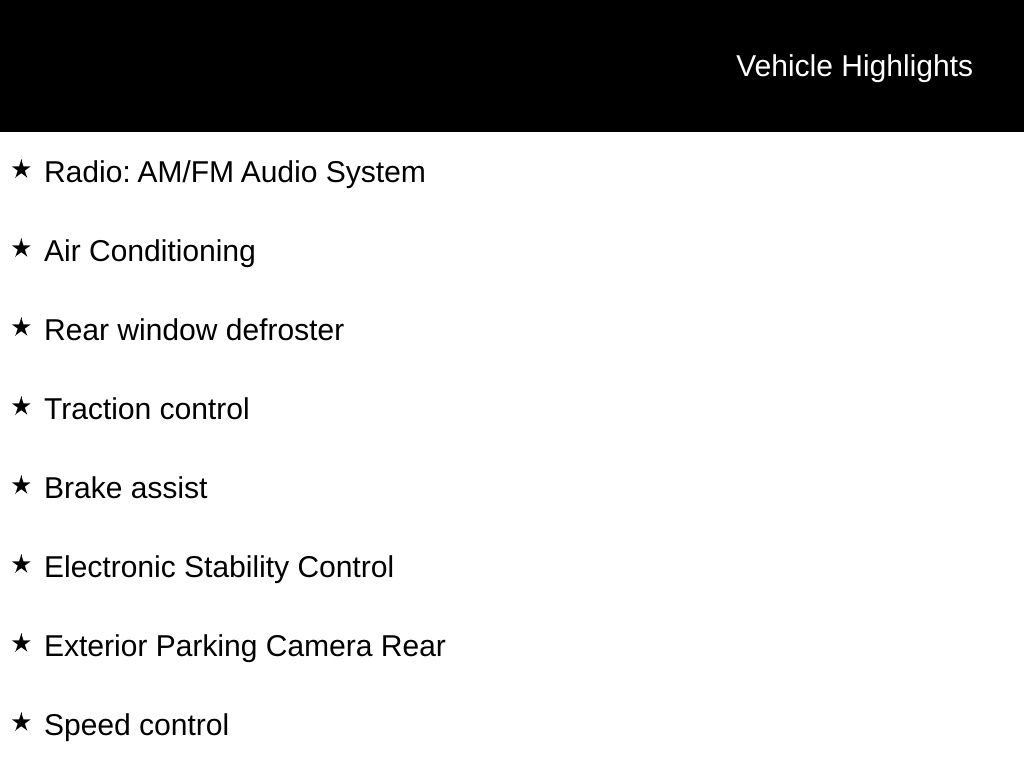 15" Wheels w/Full Covers, Air Conditioning, Brake assist, Cloth Seat Trim, Electronic Stability Control, Exterior Parking Camera Rear, Radio: AM/FM Audio System, Rear window defroster, Speed control, Traction control.
