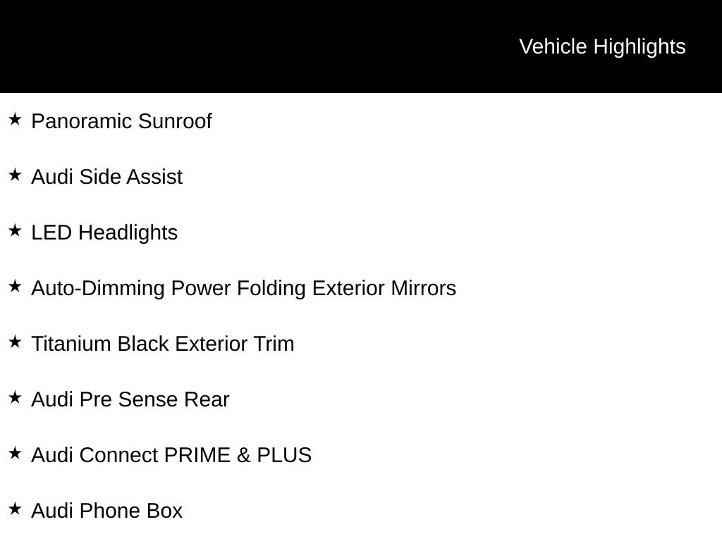 Standout features include the MMI Navigation Plus system with MMI Touch, Audi Virtual Cockpit, Audi Side Assist, and a panoramic sunroof. The Audi Advanced Key and Audi Phone Box further enhance the convenience and connectivity of this exceptional SUV.