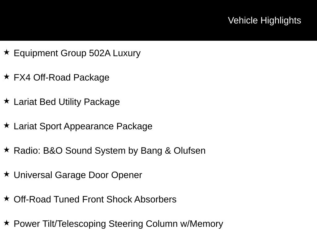 Step inside this Lariat and experience the epitome of comfort and convenience. The leather-trimmed bucket seats and heated steering wheel will keep you cozy, while the 110V/400W outlet and B&O sound system provide the perfect backdrop for your adventures. The Reverse Sensing System and rain-sensing wipers add an extra layer of safety and convenience.