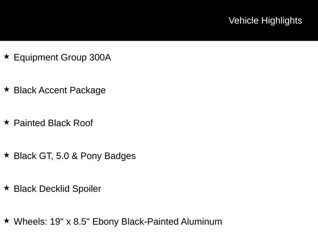 Black Accent Package, Black Decklid Spoiler, Black GT, 5.0 & Pony Badges, Equipment Group 300A, Painted Black Roof, Wheels: 19" x 8.5" Ebony Black-Painted Aluminum.