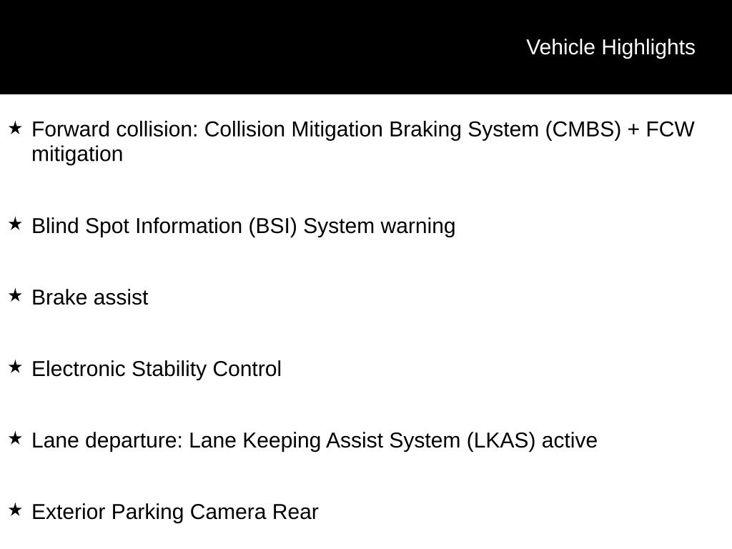 - Forward collision: Collision Mitigation Braking System (CMBS) + FCW mitigation