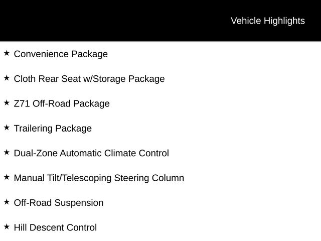 10-Speed Automatic, 4WD, Jet Black w/Perforated Leather Seat Trim, 10-Way Power Driver Seat w/Lumbar, Cloth Rear Seat w/Storage Package, Convenience Package, Dual Exhaust w/Polished Outlets, Dual-Zone Automatic Climate Control, Heated Driver & Front Outboard Passenger Seats, Heated Steering Wheel, Heavy-Duty Air Filter, Hill Descent Control, Hitch Guidance, Leather Wrapped Steering Wheel, Manual Tilt/Telescoping Steering Column, Off-Road Suspension, Trailering Package, Z71 Off-Road Package.