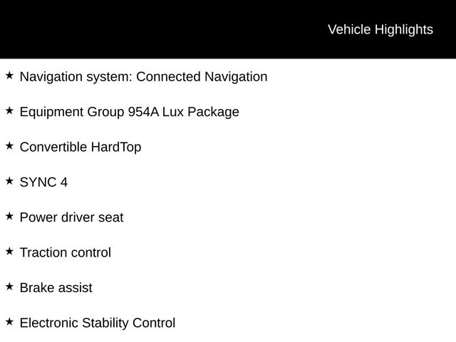 Brake assist, Convertible HardTop, Electronic Stability Control, Equipment Group 954A Lux Package, Navigation system: Connected Navigation, Power driver seat, Speed control, SYNC 4, Traction control.