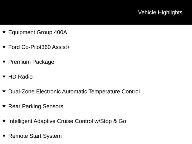 Auto-Dimming Rear-View Mirror, Body-Colored Door Handles, Dual-Zone Electronic Automatic Temperature Control, Equipment Group 400A, Evasive Steering Assist, Ford Co-Pilot360 Assist+, HD Radio, Heated Steering Wheel, Intelligent Adaptive Cruise Control w/Stop & Go, Leather-Trimmed Heated Sport Contour Bucket Seats, Premium Package, Rear Parking Sensors, Remote Start System, Universal Garage Door Opener (UGDO), Voice-Activated Touchscreen Navigation System, Wireless Charging Pad.