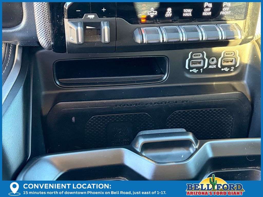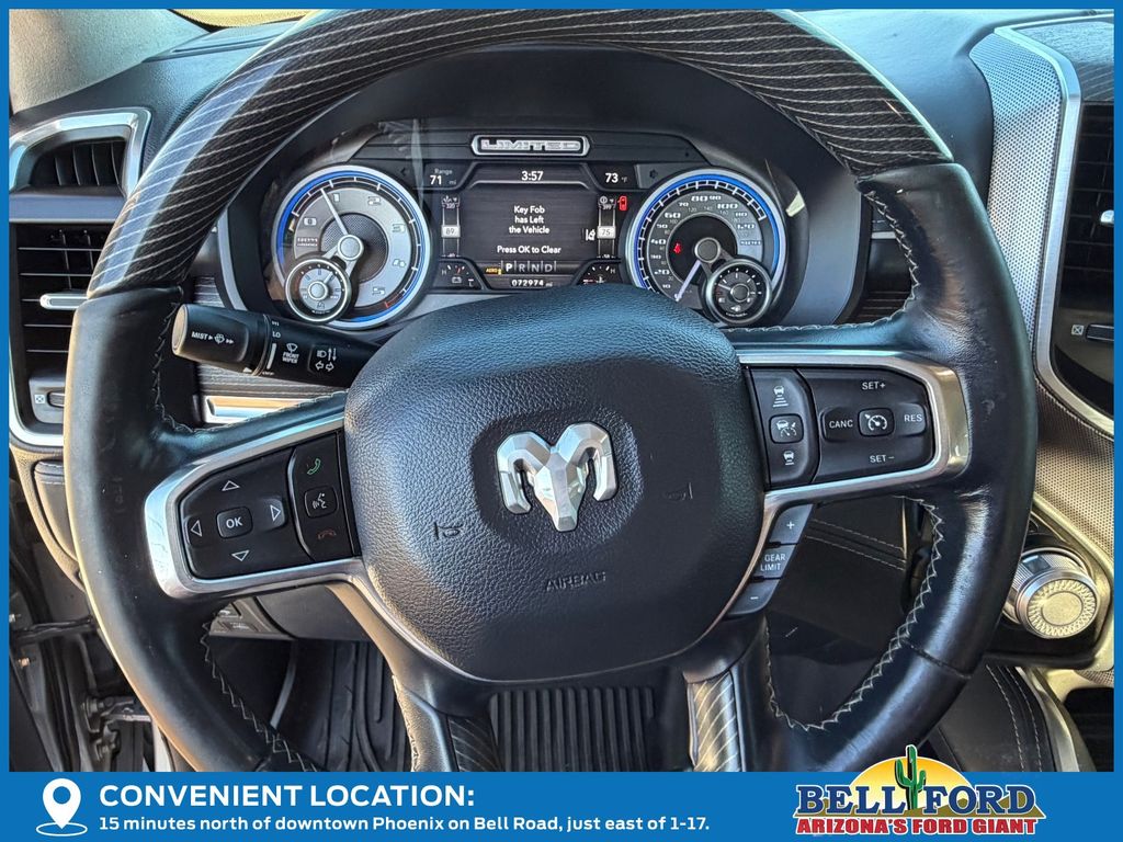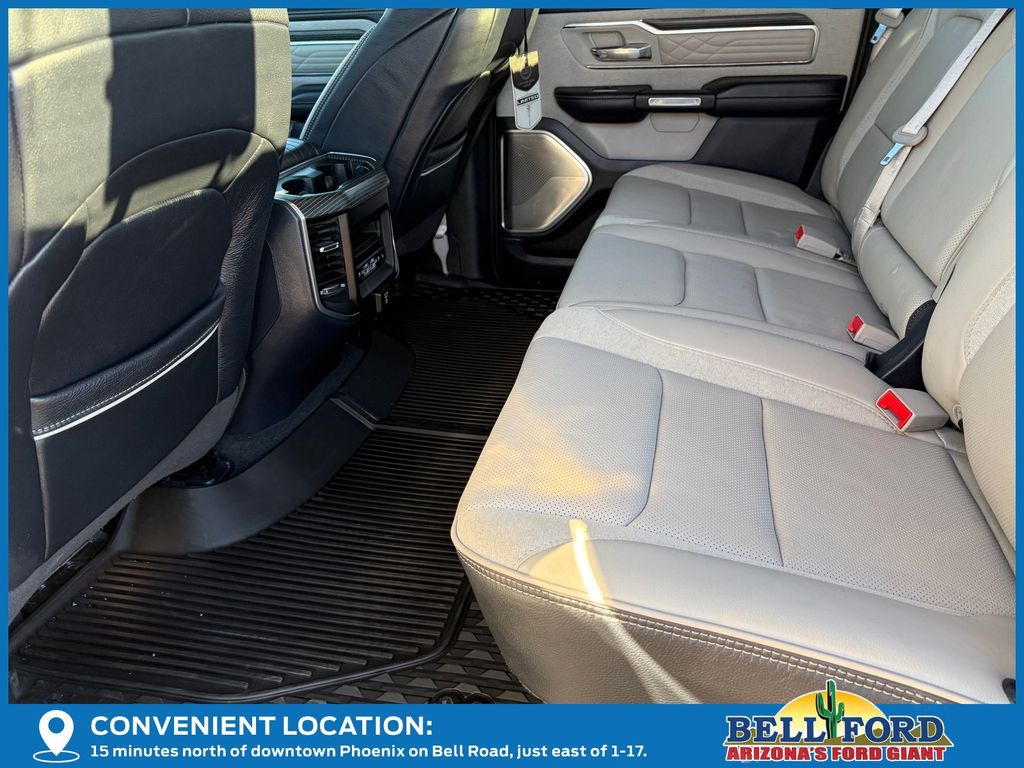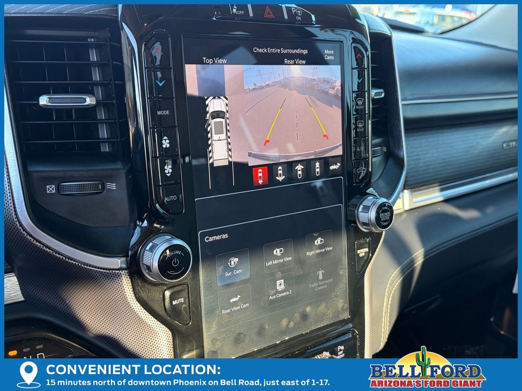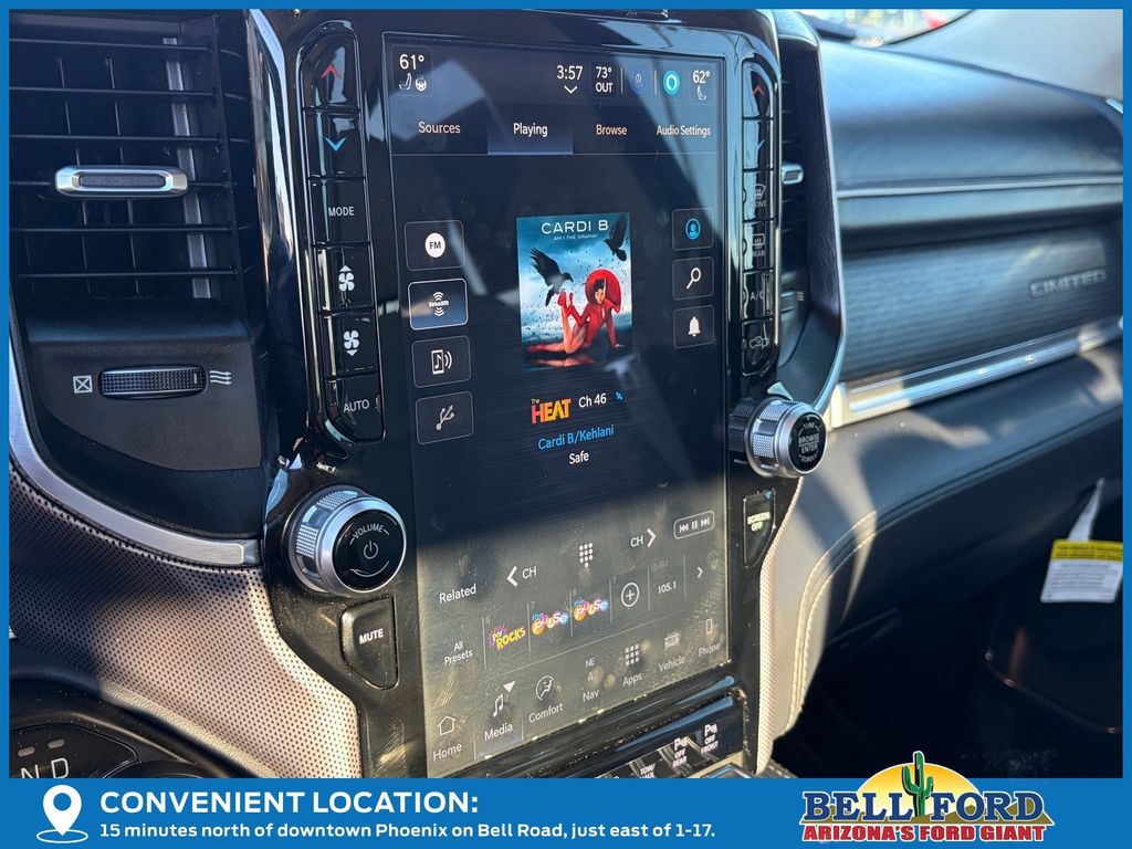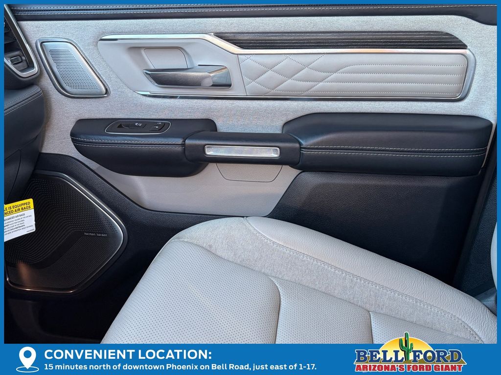 ** HERE AT BELL FORD ITS ALL ABOUT THE EXPERIENCE** Please visit us online at www.bellford.com This Ram 1500 is equipped with the following options: Body Color Bumper Group (Body Color Front Bumper and Body Color Rear Bumper w/Step Pads), Cold Weather Group (Engine Block Heater and MOPAR Winter Front Grille Cover), Limited 10th Anniversary Edition (4 Way Front Headrests, Bucket Seats, Driver Seat Memory, Front Seat Back Map Pockets, Full Length Premium Floor Console, Heated Front Seats, Heated Second Row Seats, Heated Steering Wheel, Instrument Cluster Theme 8, MOPAR 4 Adjustable Cargo Tie-Down Hooks, MOPAR Bright Pedal Kit, MOPAR Deployable Bed Step Center Mount, Multi-Function Tailgate, Power 4-Way Driver Lumbar Adjust, Power 4-Way Passenger Lumbar Adjust, Power 8-Way Driver & Passenger Seats, Premium Quilted Leather Bucket Seats, Rear 60/40 Folding Split Recline Seat, Rotary Shifter-Jeweled, Suede Headliner, Tailgate Ajar Warning Lamp, Ventilated Front Seats, Ventilated Rear Seats, and harman/kardon 19 Speaker Premium Sound), Quick Order Package 28M Limited, Limited Level 1 Equipment Group (Adaptive Cruise Control w/Stop & Go, Digital Rearview Mirror, Heads-Up Display, Lane Keep Assist, LED CHMSL Lamp, Parallel & Perp Park Assist w/Stop, Pedestrian Emergency Braking, and Surround View Camera System), Night Edition (Accent Color Premium Power Mirrors, Auto-Dimming Exterior Driver Mirror, Auto-Dimming Exterior Passenger Mirror, Black Day Light Opening Moldings, Black Exterior Truck Badging, Black Grille Surround Texture 7 Black, Black Headlamp Bezels, Black Painted Exterior Mirrors Caps, Body Color Door Handles, Convex Wide-Angle Mirror Insert, Dual Exhaust w/Black Tips, Exterior Mirrors Courtesy Lamps, Exterior Mirrors w/Heating Element, Exterior Mirrors w/Memory, Exterior Mirrors w/Supplemental Signals, Power-Folding Mirrors, RAM Grille Badge - Black, Sport Performance Hood, Tow Hooks, Tri-Fold Tonneau Cover, and Wheels: 22" x 9" Black Aluminum), 10 Speakers, 3.21 Rear Axle Ratio, 33 Gallon Fuel Tank, 4-Wheel Disc Brakes, 48V Belt Starter Generator, ABS brakes, Active Noise Control System, Adjustable pedals, Air Conditioning, Alloy wheels, AM/FM radio: SiriusXM with 360L, Apple CarPlay/Android Auto, Audio memory, Auto High-beam Headlights, Auto-dimming door mirrors, Auto-dimming Rear-View mirror, Auto-leveling suspension, Automatic temperature control, Bodyside moldings, Brake assist, Bumpers: chrome, Chrome Exterior Mirrors, Chrome Power-Fold Trailer Tow Mirrors, Compass, Delay-off headlights, Driver door bin, Driver vanity mirror, Dual front impact airbags, Dual front side impact airbags, Dual Rear Exhaust w/Bright Tips, Electronic Stability Control, Exterior 115V AC Outlet, Front anti-roll bar, Front Bucket Seats, Front Center Armrest w/Storage, Front dual zone A/C, Front fog lights, Front License Plate Bracket, Front reading lights, Front wheel independent suspension, Fully automatic headlights, Garage door transmitter, Genuine wood console insert, Genuine wood dashboard insert, Genuine wood door panel insert, Heated door mirrors, Heated front seats, Heated rear seats, Heated steering wheel, Heavy-Duty Engine Cooling, HEMI Badge, Illuminated entry, Leather steering wheel, Low tire pressure warning, Manufacturer's Statement of Origin, Memory seat, Mirror Clearance/Running Lights, Mirror-Mounted Aux Reverse Lamps, Navigation System, Occupant sensing airbag, Outside temperature display, Overhead airbag, Overhead console, Panic alarm, ParkView Rear Back-Up Camera, Passenger door bin, Passenger vanity mirror, Pedal memory, Power door mirrors, Power driver seat, Power passenger seat, Power steering, Power windows, Premium Leather Trimmed Bucket Seats, Radio data system, Radio: Uconnect 5 Nav w/12.0" Display, Rain sensing wipers, RamBox Cargo Management System, Rear anti-roll bar, Rear seat center armrest, Rear step bumper, Rear window defroster, Remote keyless entry, Security system, Speed control, Split folding rear seat, St