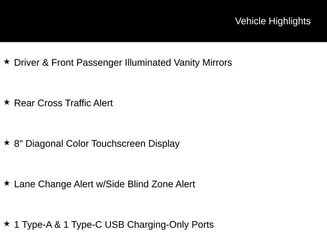 1 Type-A & 1 Type-C USB Charging-Only Ports, 120-Volt Power Outlet, 8" Diagonal Color Touchscreen Display, Cabin Humidity Sensor, Convenience Package, Driver & Front Passenger Illuminated Vanity Mirrors, Driver Confidence Package, Inside Rear-View Auto-Dimming Mirror, Lane Change Alert w/Side Blind Zone Alert, Preferred Equipment Group 1LT, Rear Cross Traffic Alert, Rear Park Assist, Single-Zone Auto Climate Control Air Conditioning.