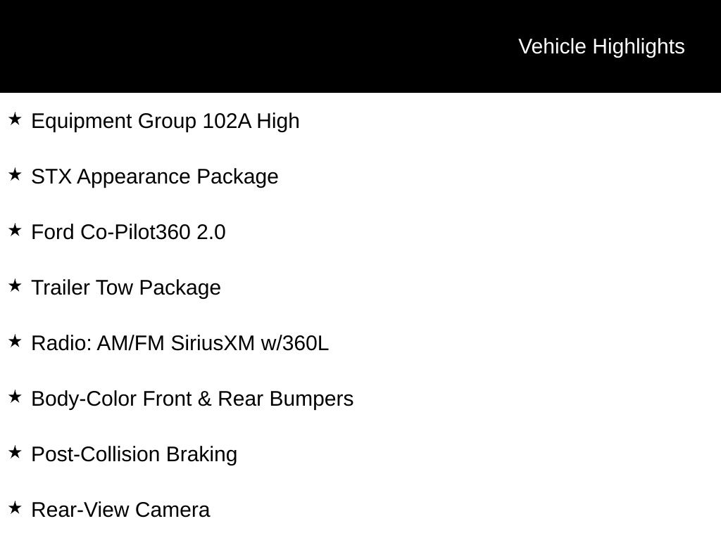 The STX Appearance Package adds a touch of style with its body-color front and rear bumpers, molded-in color black honeycomb grille, and box side decals. The Trailer Tow Package ensures you can haul your gear with ease, thanks to the integrated trailer brake controller and class IV trailer hitch receiver. And with the Equipment Group 102A High, you'll enjoy advanced safety features like Ford Co-Pilot360 2.0, which includes Reverse Brake Assist, BLIS with Cross-Traffic Alert, and more.