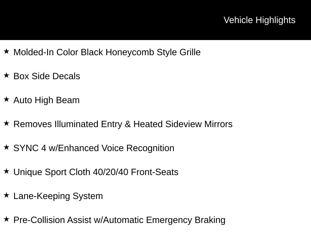 Inside, the unique sport cloth 40/console/40 front seats provide all-day comfort, while the SYNC 4 infotainment system with enhanced voice recognition keeps you connected on the go. The extended-range 36-gallon fuel tank means fewer stops at the pump, and the electronic locking differential with 3.31 axle ratio delivers impressive capability.