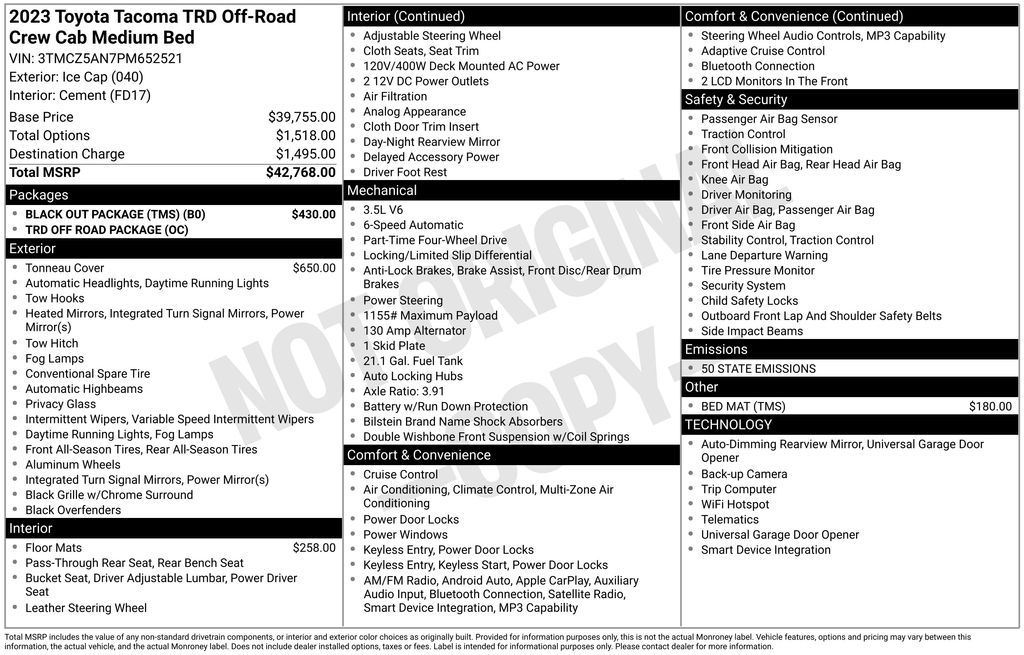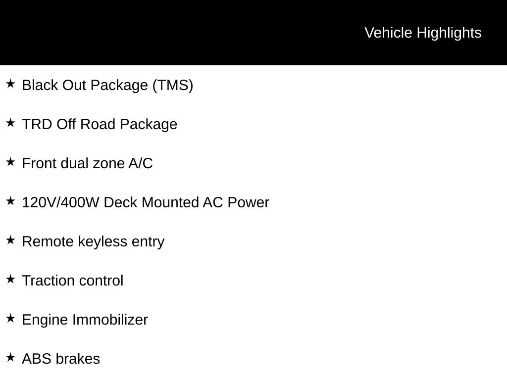 4WD, 120V/400W Deck Mounted AC Power, ABS brakes, Alloy wheels, Apple CarPlay/Android Auto, Black Out Package (TMS), Black Overfenders, Electronic Stability Control, Engine Immobilizer, Front dual zone A/C, Heated door mirrors, Illuminated entry, Low tire pressure warning, Power Sliding Rear Window w/Privacy Glass, Remote keyless entry, Traction control, TRD Off Road Package.