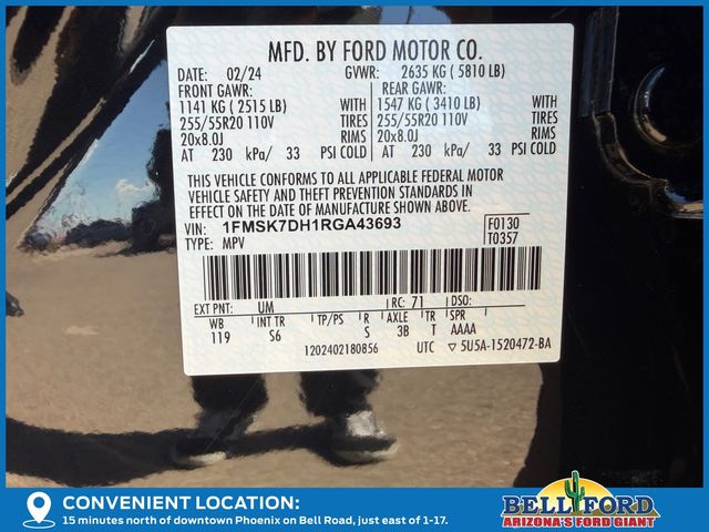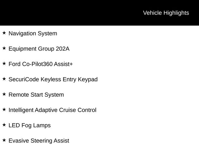 Equipment Group 202A, Evasive Steering Assist, Ford Co-Pilot360 Assist+, Heated ActiveX Captain's Chairs, Heated Steering Wheel, Intelligent Adaptive Cruise Control, LED Fog Lamps, Navigation System, Remote Start System, SecuriCode Keyless Entry Keypad, Speed Sign Recognition, Voice-Activated Touchscreen Navigation System.