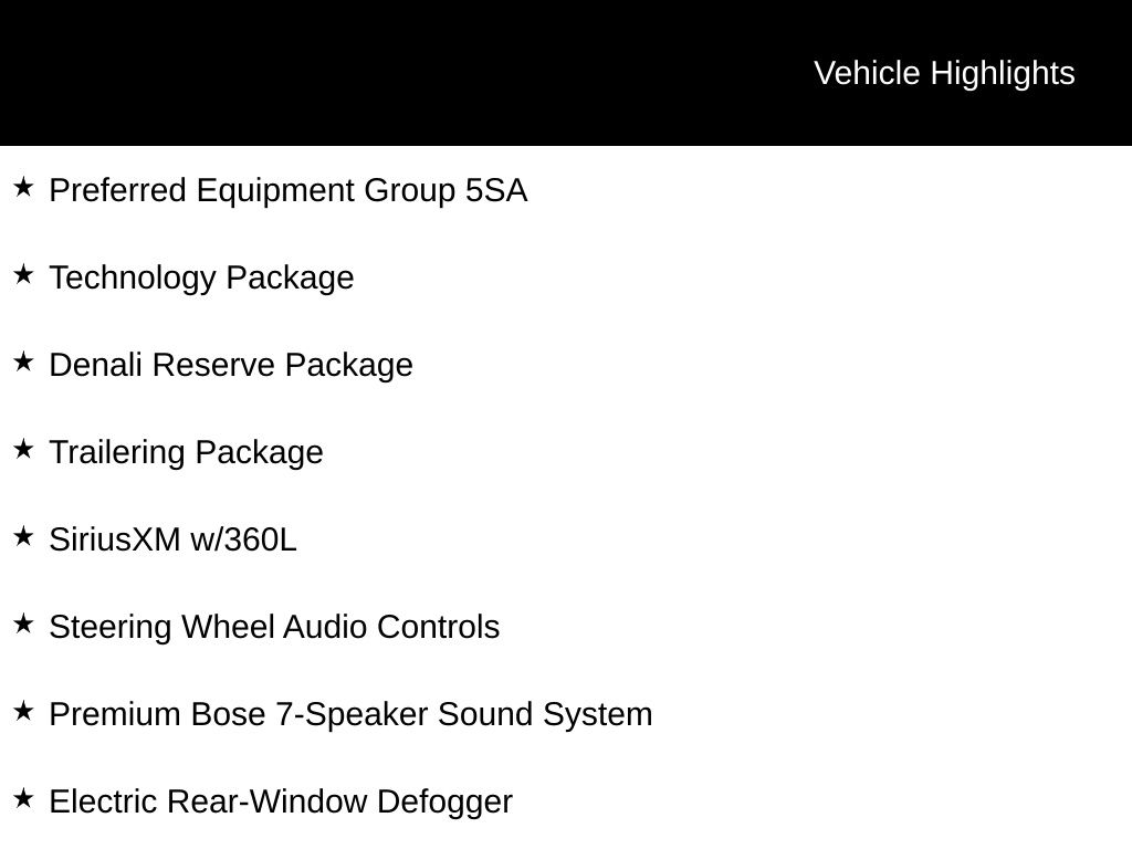 10-Speed Automatic, 4WD, Jet Black Leather, 120-Volt Bed Mounted Power Outlet, 120-Volt Interior Power Outlet, 170 Amp Alternator, 2 Charge/Data USB Ports Inside Center Console, 2 Type-C Charge-Only Rear USB Ports, 2 USB Ports, Auto-Locking Rear Differential, Auxiliary External Transmission Oil Cooler, Bed View Camera, Chrome Header w/Signature Denali Chrome Grille, Chrome Recovery Hooks, Chrome Wheel To Wheel Assist Steps, Color-Keyed Carpeting Floor Covering, Deep-Tinted Glass, Denali Reserve Package, Electric Rear-Window Defogger, Floor-Mounted Center Console, Front Rain-Sensing Wipers, GMC Connected Access Capable, GMC MultiPro Power Steps, HD Surround Vision, Heated 2nd Row Outboard Seats, Heated Driver & Front Outboard Passenger Seating, Heavy-Duty Air Filter, Hill Descent Control, Hitch Guidance, Hitch View, In-Vehicle Trailering System App, Integrated Trailer Brake Controller, Keyless Open & Start, LED Cargo Area Lighting, Multicolor 15" Diagonal Head-Up Display, OnStar & GMC Connected Services Capable, Perimeter Lighting, Power Door Locks, Power Front Passenger Windows w/Express Up/Down, Power Front Windows w/Driver Express Up/Down, Power Rake & Telescoping Steering Column, Power Rear Windows w/Express Down, Power Sliding Rear Window w/Rear Defogger, Power Sunroof, Preferred Equipment Group 5SA, Premium Bose 7-Speaker Sound System, Push Button Start, Rear Camera Mirror, Rear Cross Traffic Braking, Rear Pedestrian Detection, Rear Wheelhouse Liners, Remote Vehicle Starter System, SiriusXM w/360L, Spray-On Pickup Bedliner w/Denali Logo, Steering Wheel Audio Controls, Technology Package, Theft Deterrent System (Unauthorized Entry), Trailer Camera Provisions, Trailer Side Blind Zone Alert, Trailering Package, Ultrasonic Front & Rear Park Assist, Universal Home Remote, Ventilated Driver & Front Passenger Seats, Wheel Locks (Set of 4) (LPO), Wheels: 22" x 9" Painted Aluminum, Wi-Fi Hotspot Capable, Wireless Charging.
