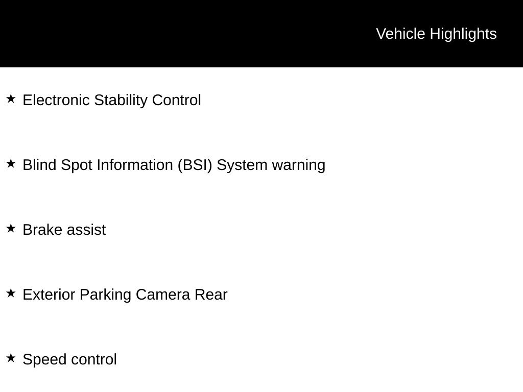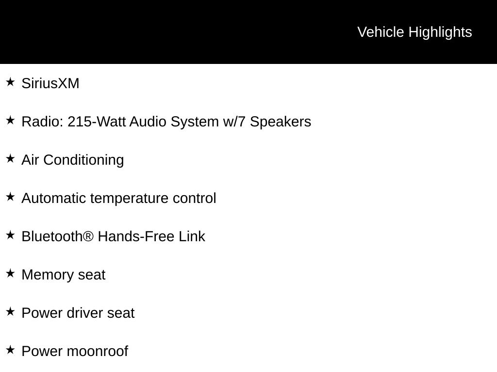 Black w/Leather Seat Trim, Air Conditioning, Automatic temperature control, Blind Spot Information (BSI) System warning, Bluetooth Hands-Free Link, Brake assist, Electronic Stability Control, Exterior Parking Camera Rear, Memory seat, Power driver seat, Power moonroof, Radio: 215-Watt Audio System w/7 Speakers, SiriusXM, Speed control.