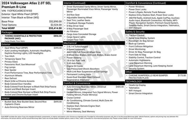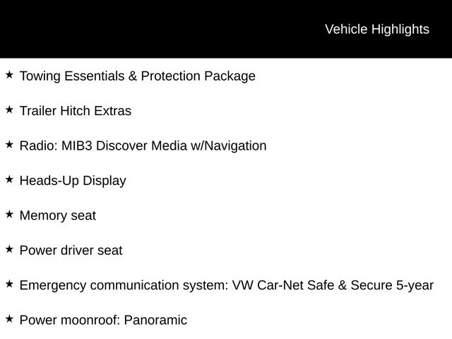 3rd row seats: split-bench, Brake assist, Electronic Stability Control, Emergency communication system: VW Car-Net Safe & Secure 5-year, Exterior Parking Camera Rear, Heads-Up Display, Memory seat, Power driver seat, Power moonroof: Panoramic, Privacy Cover, Radio: MIB3 Discover Media w/Navigation, Towing Essentials & Protection Package, Trailer Hitch Extras, Wheels: 21" 2-Tone Machined Alloy.