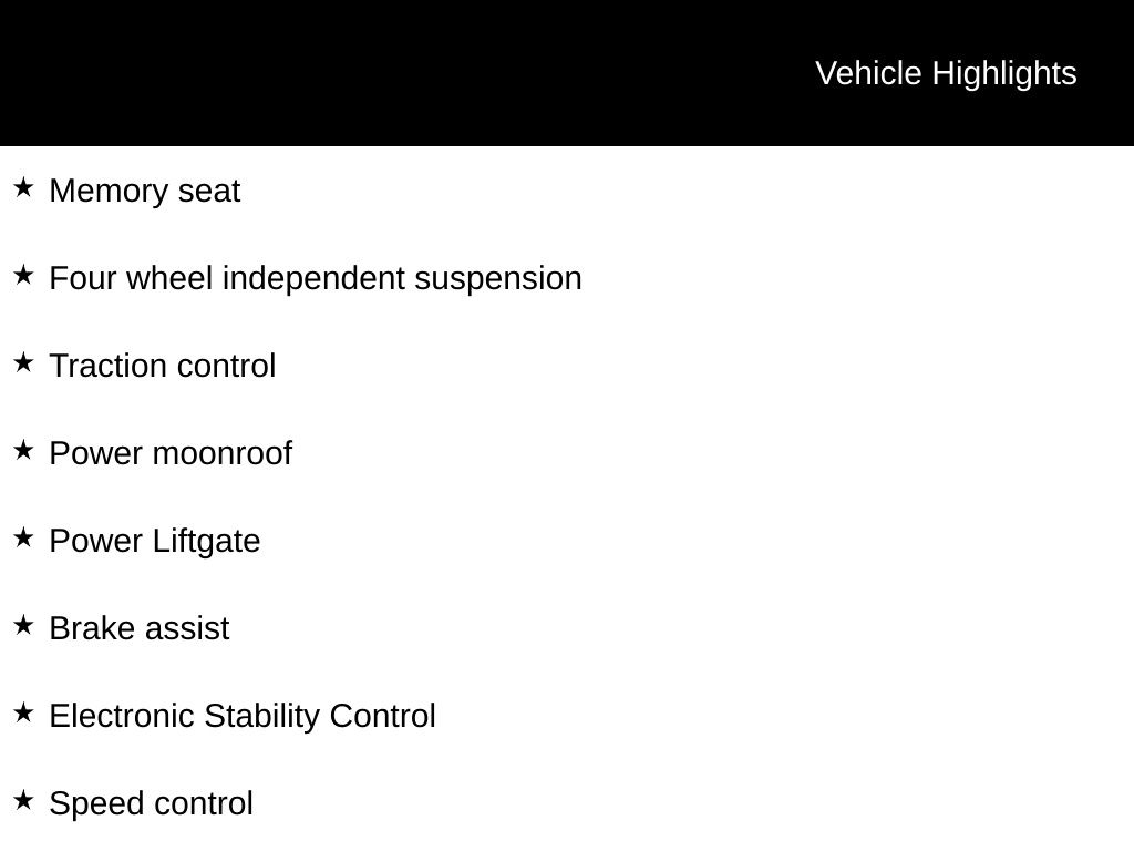 AWD, 19" Alloy Wheels, Air Conditioning, Apple CarPlay & Android Auto, Automatic temperature control, Brake assist, Electronic Stability Control, Four wheel independent suspension, Front dual zone A/C, Heads-Up Display, Memory seat, Navigation System, Option Group 01, Power driver seat, Power Liftgate, Power moonroof, Radio: Bose Premium w/AM/FM/HD Audio System, Speed control, Traction control.