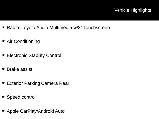 2.5L 4-Cylinder 16V DOHC, Boulder Cloth, Air Conditioning, Apple CarPlay/Android Auto, Brake assist, Electronic Stability Control, Exterior Parking Camera Rear, Radio: Toyota Audio Multimedia w/8" Touchscreen, Speed control.
